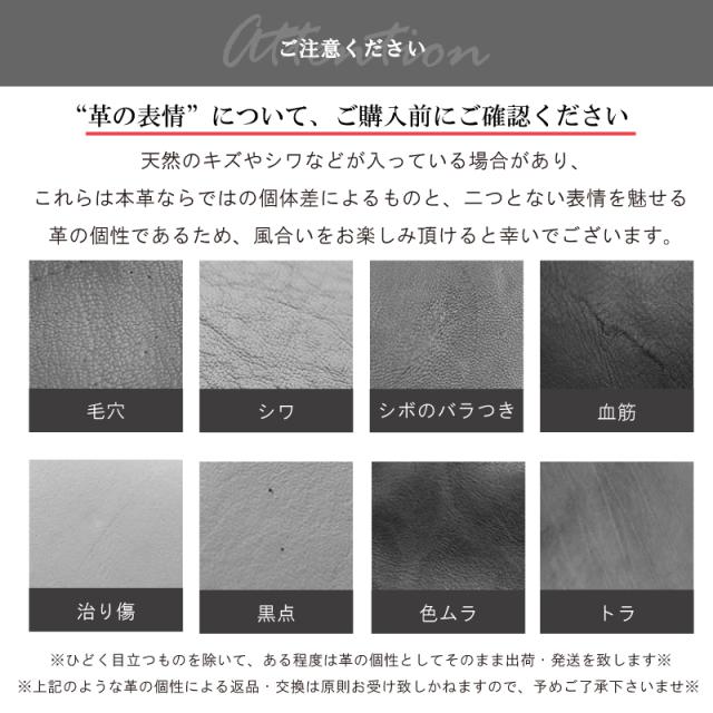 | 注意事項 | 当店で使用している本革は全て本物の革を使用しています。 その為、皮革の模様など掲載画面と異なる場合がございます。 ※ご覧頂いている商品の写真につきましては、できるだけ実物の色に近くなるように努めておりますが、 お使いの環境(モニター、ブラウザ等)の違いにより、色の見え方が実物と若干異なる場合がございます。※ ※掲載商品と色味、模様・柄が異なる理由などのイメージ違いで返品・交換の場合は、返送料お客様ご負担での返送をお願いしております。 予めご了承くださいませ。※ |