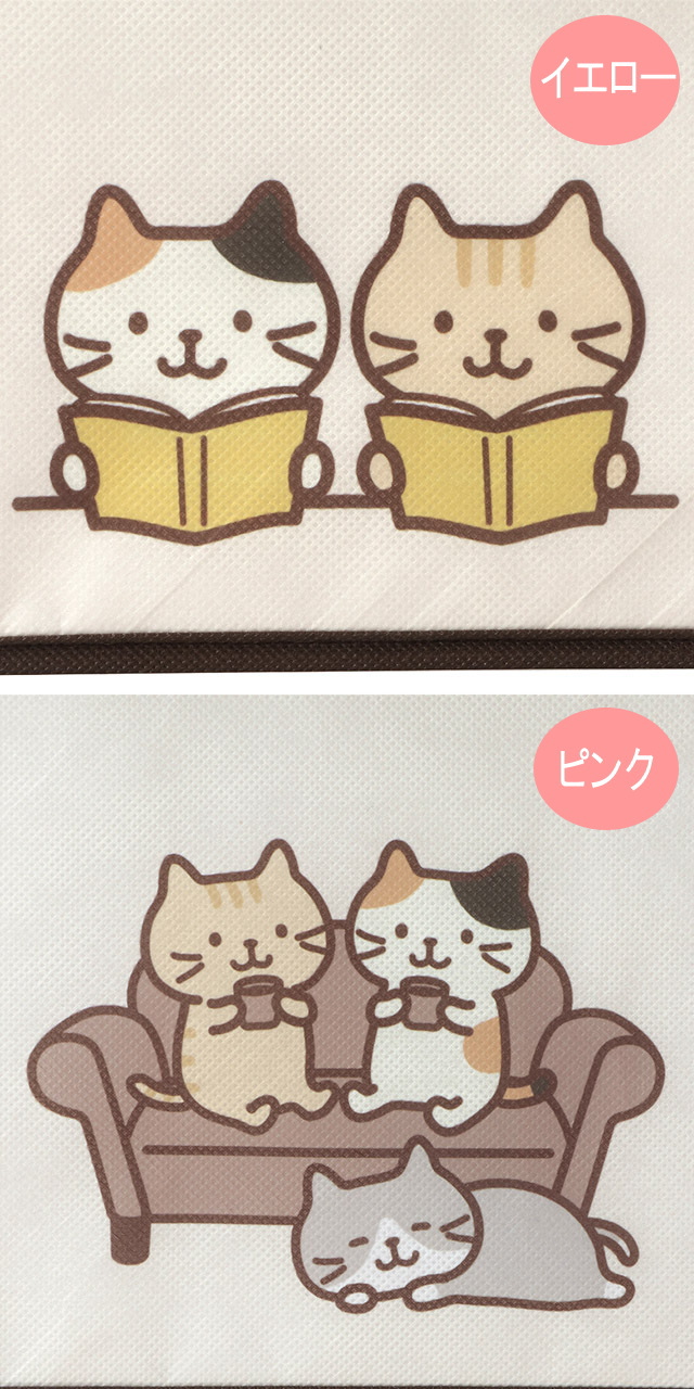 絵柄は にゃんこが 本を読む「イエロー」と まったりお茶する「ピンク」の2柄展開。