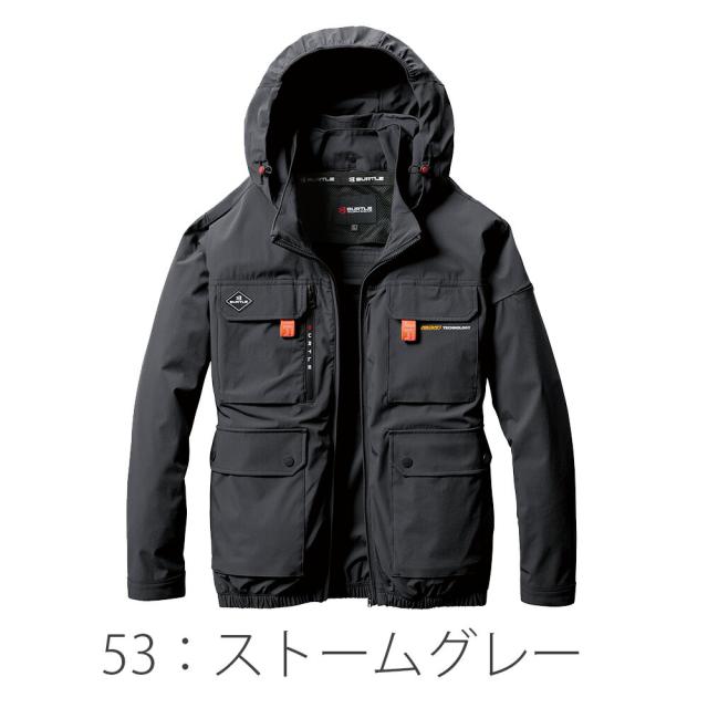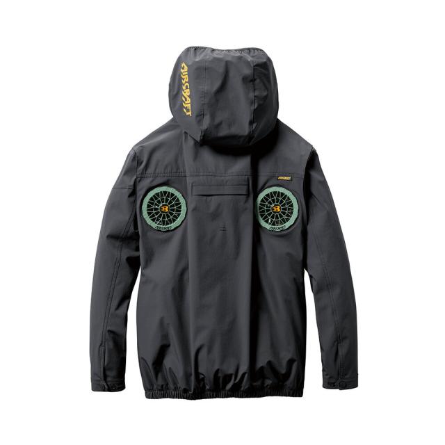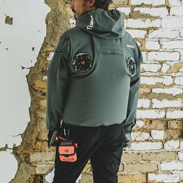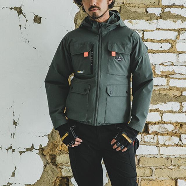 ヘルメットに対応する大型フードは用途に合わせて着脱可能
