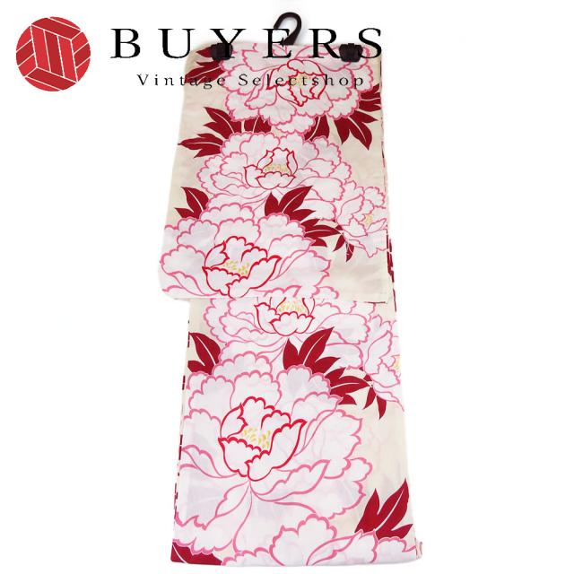中古 浴衣 未使用展示品 綿 クリーム系 えんじ ピンク ぼたん 大柄 大人可愛い 和装 呉服 和服 きもの レディース 女性