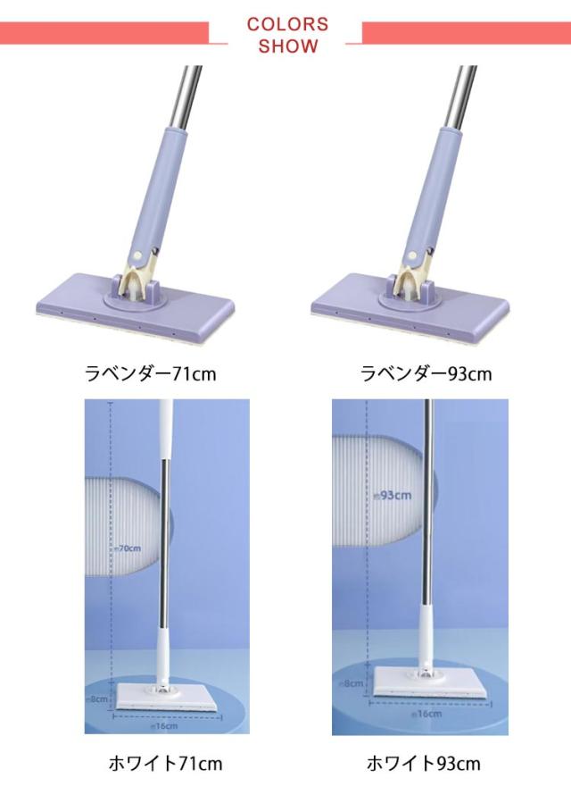 | サイズについての説明 | 【サイズ】 【フロアワイパー本体】幅16cm 縦8cm 長さ71cm/93cm ※上記サイズは平置き実寸になります。 サイズ表の実寸法は商品によって1-3cm程度の誤差がある場合がございます。 |