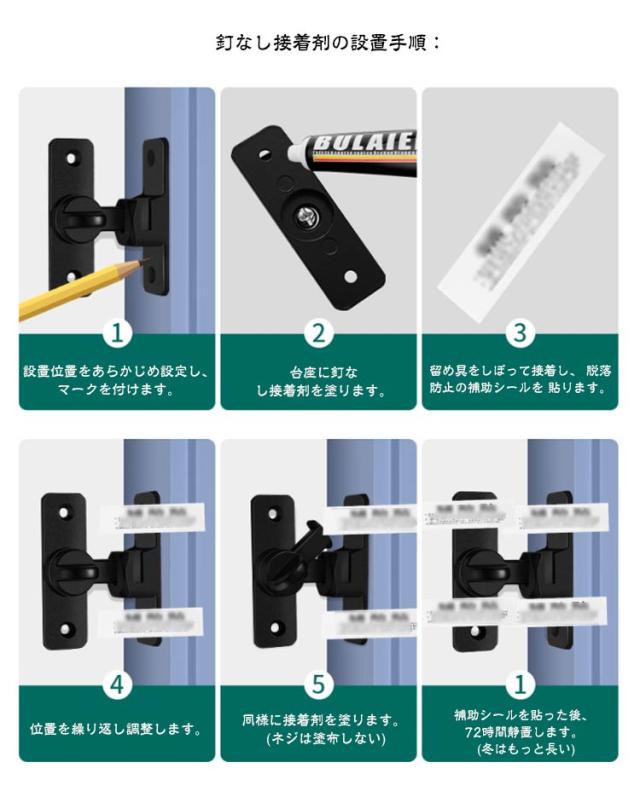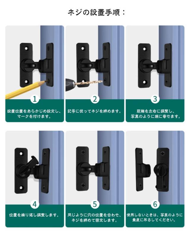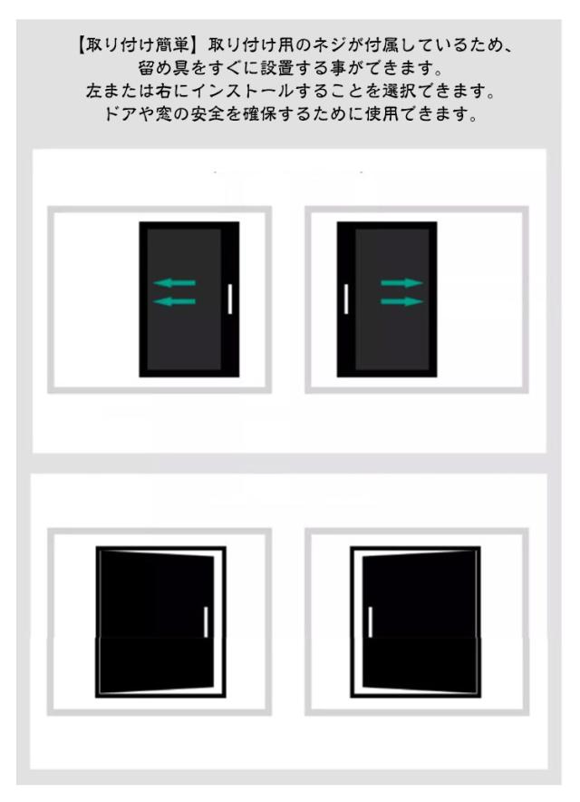 | 【90度・180度2WAY仕様】90度も180度も取り付けられるから、開き戸も引き戸も様々なドアに対応できます。 【高品質素材】高品質な亜鉛合金のドアバックルは、多層研磨仕上げで構成され、厚くて強化されたベース、強度が高く、腐食、錆や変色の心配はありません。簡単に壊れたり変形したりせず、耐久性に優れています。4球軸受構造を採用し、スムーズに回転でき、ワンタッチに簡単に開閉できます。 【便利でシンプル】便利なフリップデザイン、プライバシーロック、フラップは、より快適な生活環境のためにさらなるセキュリティを提供します。 【取り付け簡単】取り付け用のネジが付属しているため、留め具をすぐに設置する事ができます。左または右にインストールすることを選択できます。ドアや窓の安全を確保するために使用できます。 【安全保護】子供ケガ防止だけでなく、部屋の外に出ていかないようにしたり、様々な危険を防止できます。簡単施錠でスライドドアの防犯対策ができます。猫の脱走防止用としてもお使いいただけます。 【幅広い用途】引き戸や部屋のドア、引き出し、バスルーム、オフィス、ホテルなど様々な場所や用途に使えます。 ネジの設置手順: 設置位置をあらかじめ設定し、マークを付けます。 記号に従ってネジを締めます。 距離を左右に調整し、写真のように端に寄せます。 位置を繰り返し調整します。 同じように穴の位置を合わせ、ネジを締めて固定します。 使用しないときは、写真のように垂直に吊るしてください。 釘なし接着剤の設置手順: 設置位置をあらかじめ設定し、マークを付けます。 台座に釘なし接着剤を塗ります。 留め具をしぼって接着し、 脱落防止の補助シールを 貼ります。 位置を繰り返し調整します。 同様に接着剤を塗ります。 (ネジは塗布しない) 補助シールを貼った後、72時間静置します。 (冬はもっと長い) | |