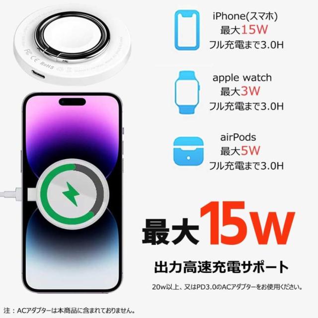 | 商品仕様 | 本体サイズ:60mmx60mmx6.8mm 材質:ABS+PC 入力:5V-12V/2A(Max) 出力: iPhone:15W/10W/7.5W/5W Apple Watch:3W(Max) AirPods:5W(Max) |