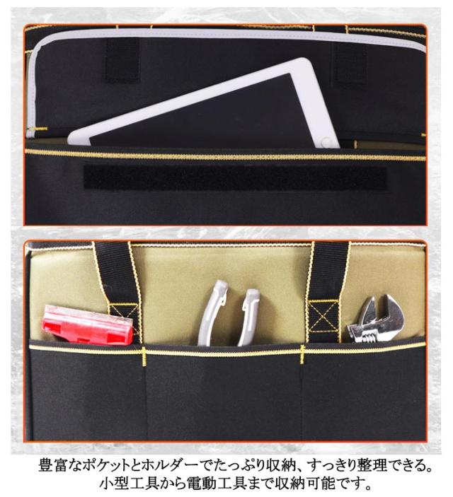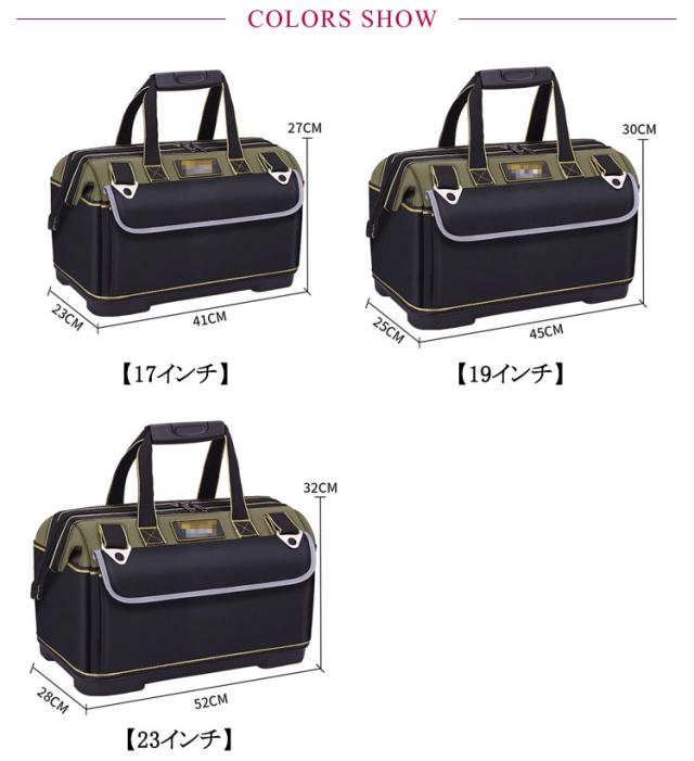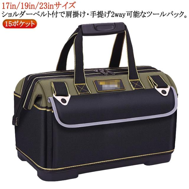 | ショルダーベルト付で肩掛け・手提げ2way可能なツールバック。【15ポケット】【17in/19in/23inサイズ】 特徴:道具工具の収納・持ち運び。探しやすく、取り出しやすい 豊富なポケットとホルダーでたっぷり収納、すっきり整理できる。小型工具から電動工具まで収納可能です。 6000D高密度オックスフォードを採用しています。強化縫製でしっかりと仕上げられ、耐荷重、耐摩擦、耐久性に優れてます。 工具入れバッグは様々な道具や工具の収納、携帯に、仕切りがついており大変便利です。ガーデニング、釣り、工芸、建築、大工、請負業者、屋根、ラインマン、石工、鉄工などの作業を携わる人に最適にします。日常生活のDIY活動だけでなく、自動車修理、木工および専門な修理活動も最適です。 | |