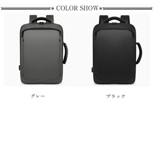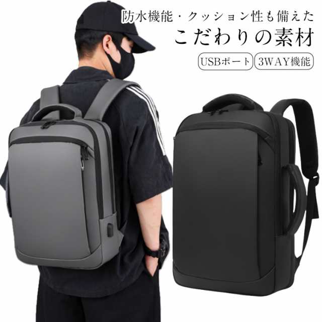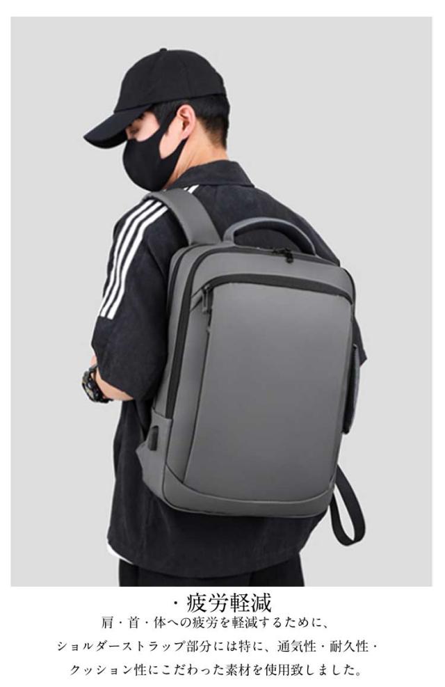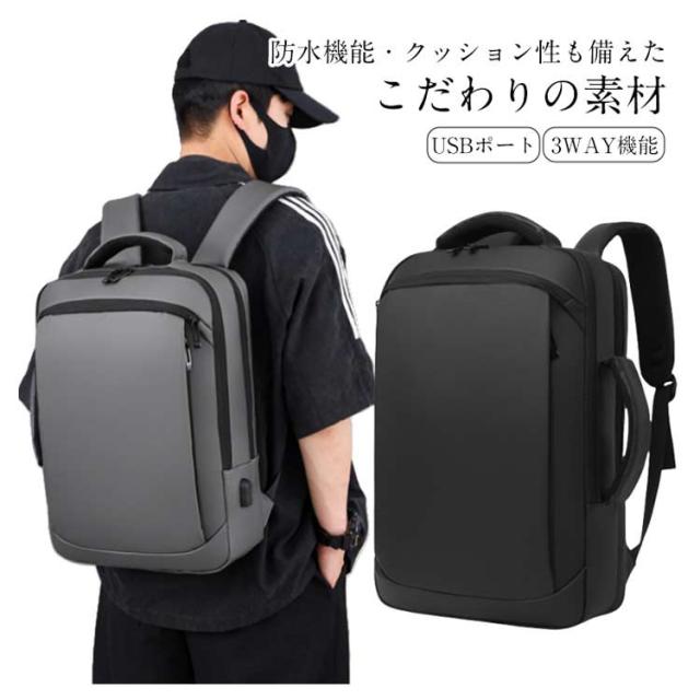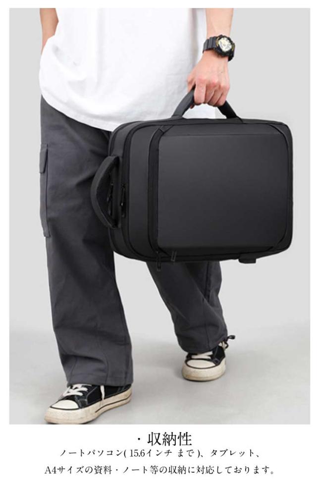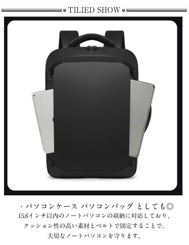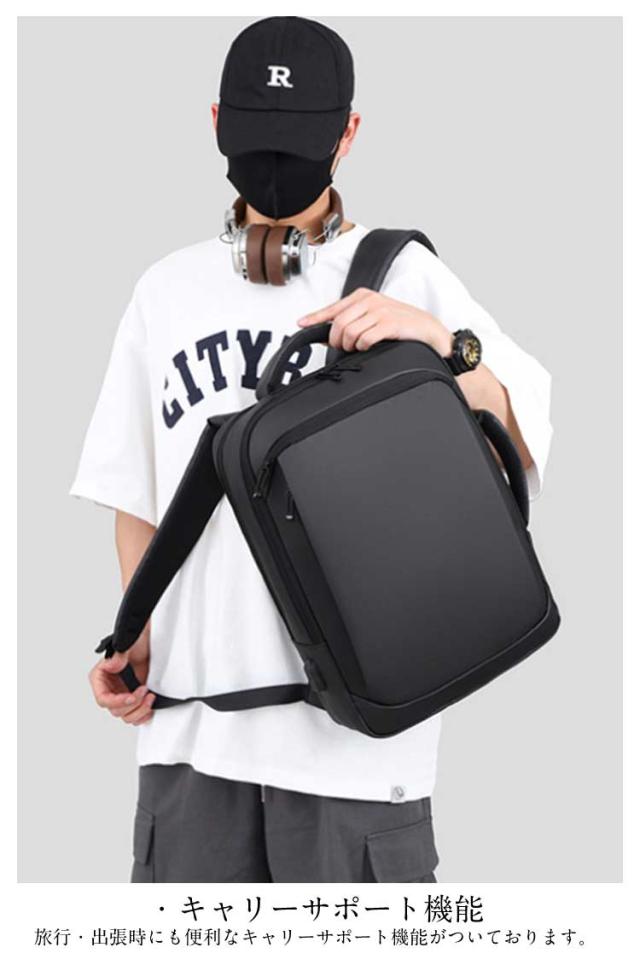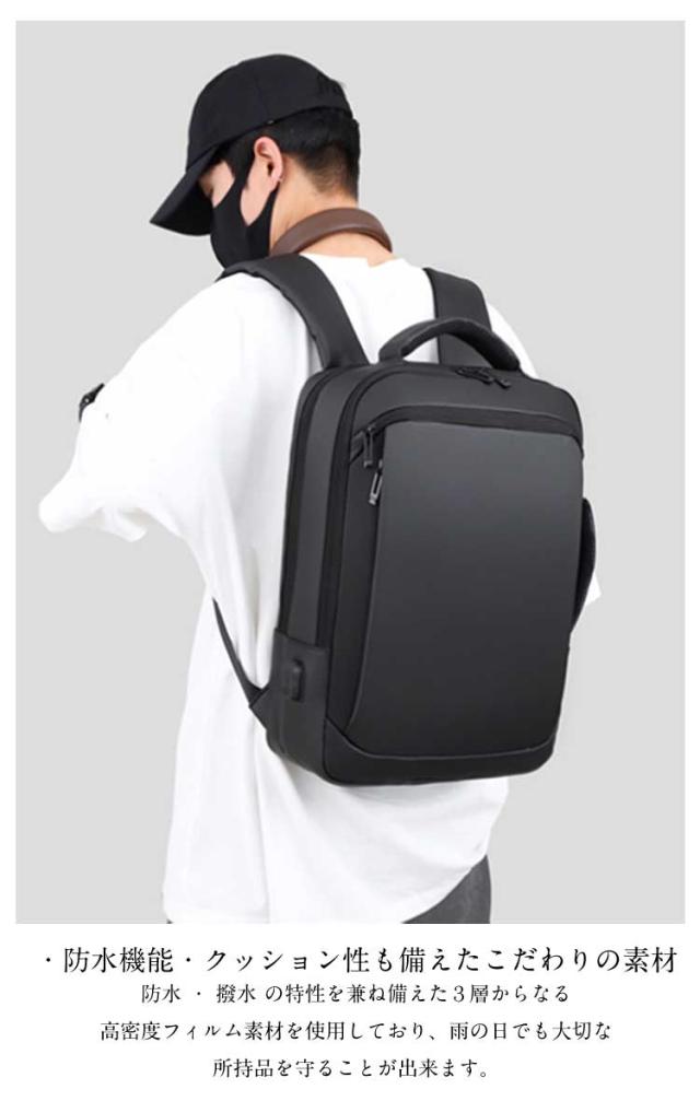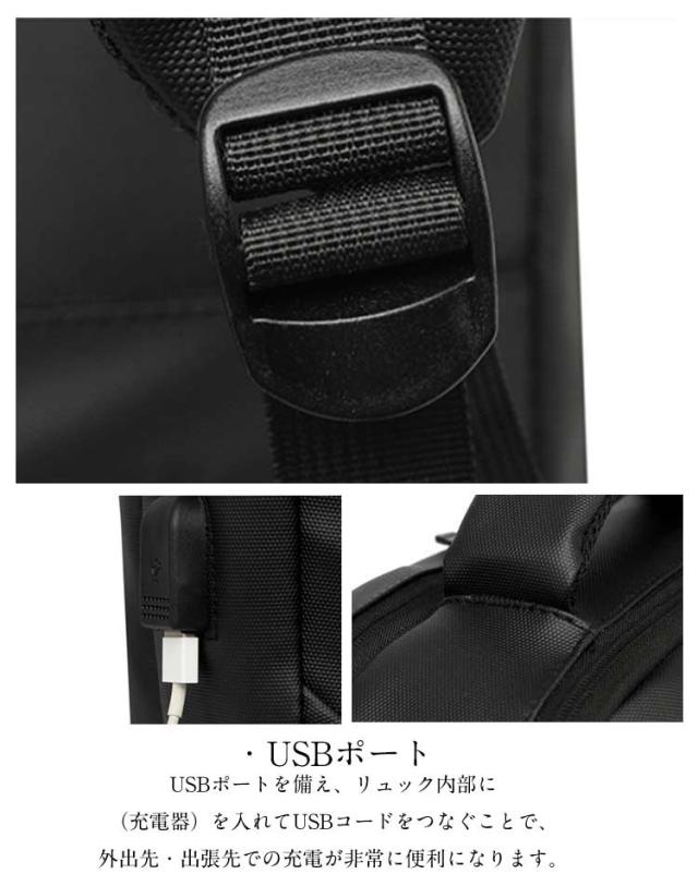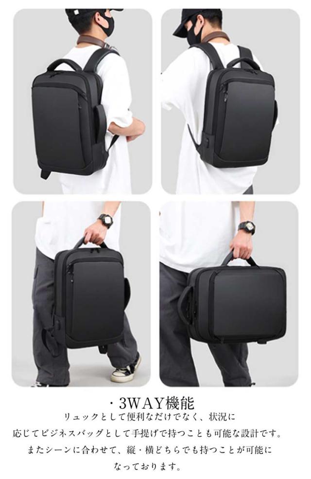 | ・防水機能・クッション性も備えたこだわりの素材 防水 ・ 撥水 の特性を兼ね備えた3層からなる高密度フィルム素材を使用しており、雨の日でも大切な所持品を守ることが出来ます。 ・パソコンケース パソコンバッグ としても◎ 15.6インチ以内のノートパソコンの収納に対応しており、クッション性の高い素材とベルトで固定することで、大切なノートパソコンを守ります。 ・USBポート USBポートを備え、リュック内部に(充電器)を入れてUSBコードをつなぐことで、外出先・出張先での充電が非常に便利になります。 ・キャリーサポート機能 旅行・出張時にも便利なキャリーサポート機能がついております。 ・疲労軽減 肩・首・体への疲労を軽減するために、ショルダーストラップ部分には特に、通気性・耐久性・クッション性にこだわった素材を使用致しました。 ・収納性 ノートパソコン( 15.6インチ まで )、タブレット、A4サイズの資料・ノート等の収納に対応しております。 ・3WAY機能 リュックとして便利なだけでなく、状況に応じてビジネスバッグとして手提げで持つことも可能な設計です。 またシーンに合わせて、縦・横どちらでも持つことが可能になっております。 | |
