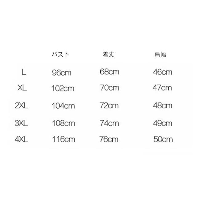 | サイズについての説明 | L XL 2XL 3XL 4XL サイズ:写真通り ※上記サイズは平置き実寸になります。サイズ表の実寸法は商品によって1-3cm程度の誤差がある場合がございます。 |