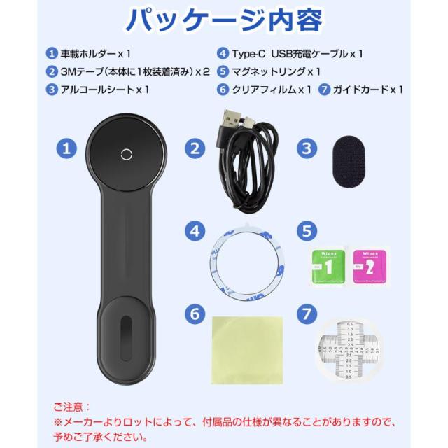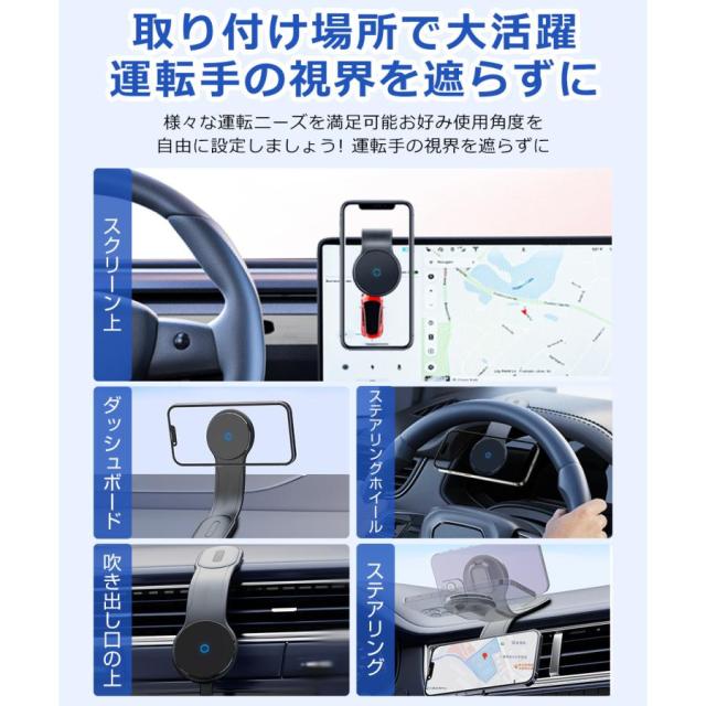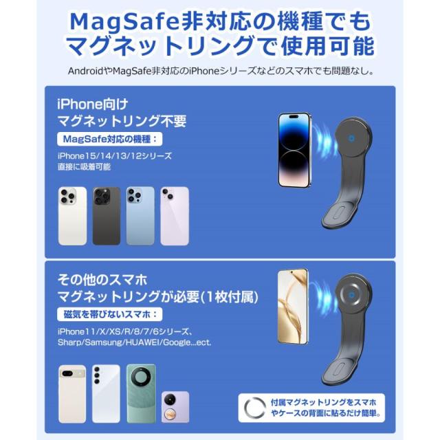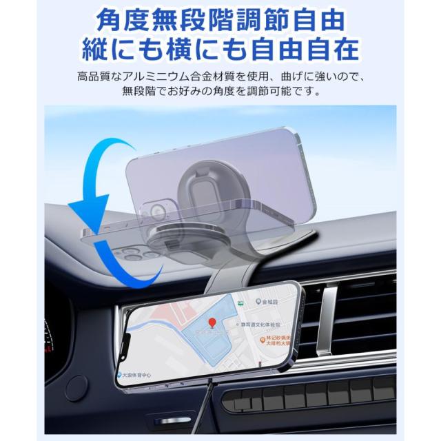 | 【2in1車載ホルダー+ワイヤレス充電器・最大15W対応】 車載でも自宅やオフィスでも活用できる2in1ホルダー・ワイヤレス充電器です。 スマートフォンを近づけるだけで自動で15Wの急速ワイヤレス充電が開始します。 ※MagSafe非対応のスマホケースを取り外してご使用ください。 ※15W急速充電には別売のPD3.0/QC3.0カーチャージャーが必要です。 【超強力で瞬間吸着】 18Nの強力な磁石が内蔵されており、ホルダーに近づくと自動的に吸着して充電できます。 悪路走行時もスマホを安定して固定できます。 【角度調節自由】 高品質なアルミニウム合金材質を使用、自由に曲げることができますので、無段階でお好みの角度を調節可能です。 車のダッシュボードに適合し、広い視野を提供するために視線を遮ることはありません。 【強力で確実な吸着】 3Mテープ採用の頑丈な作りで最大1.8kgまで耐えられ、スマホの落下を防ぎます。 楕円形デザインで粘着面が広く、車のボディに傷をつけません。 【超簡単着脱】 着脱が1秒で!片手で簡単にスマートフォンの着脱が行えます。安全運転をサポートします。 【2つのポート】 裏面に2つのポートがあり、設置角度を問わず手軽に充電できます。 ※ご注意:2つのポート同時充電は避けてください。 【取り付け場所が無限大】 車載用途だけでなく、家庭やオフィスでも活用できます。机や壁面に取り付けて、スマートフォンを自由に使うことができます。 ダッシュボード、吹き出し口、ステアリング、デスクなど、様々な場所に取り付けが可能。 【幅広い互換性】 MagSafe対応iPhone16/iPhone15/14/13/12シリーズはもちろん、iPhone 11以下シリーズ、AndroidワイヤレスなどのMagSafe非対応の機種にも付属のマグネットリングで使用可能です。
