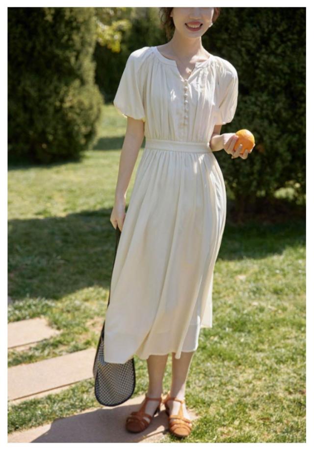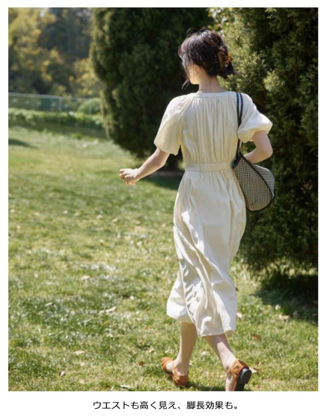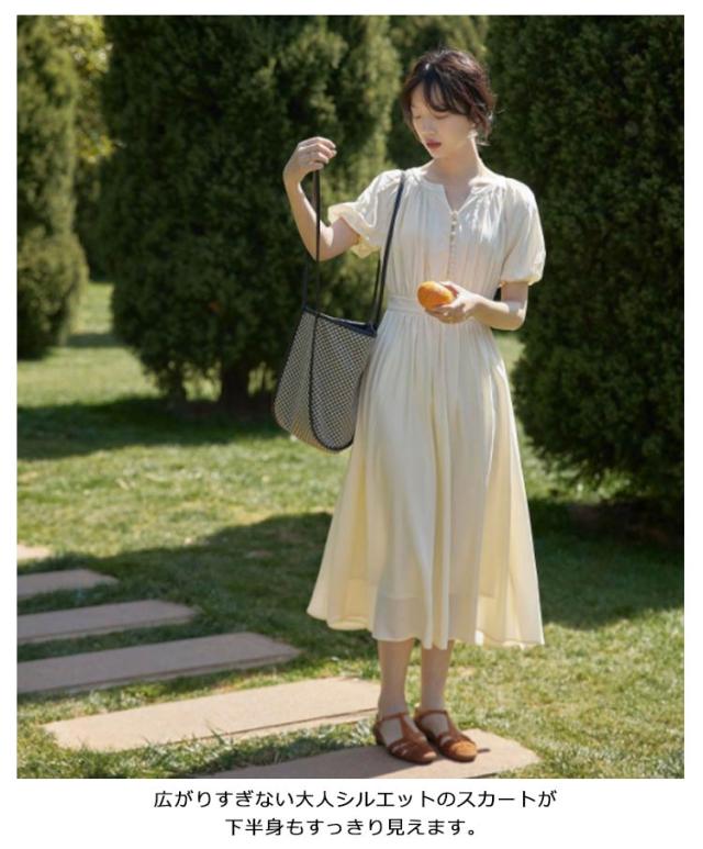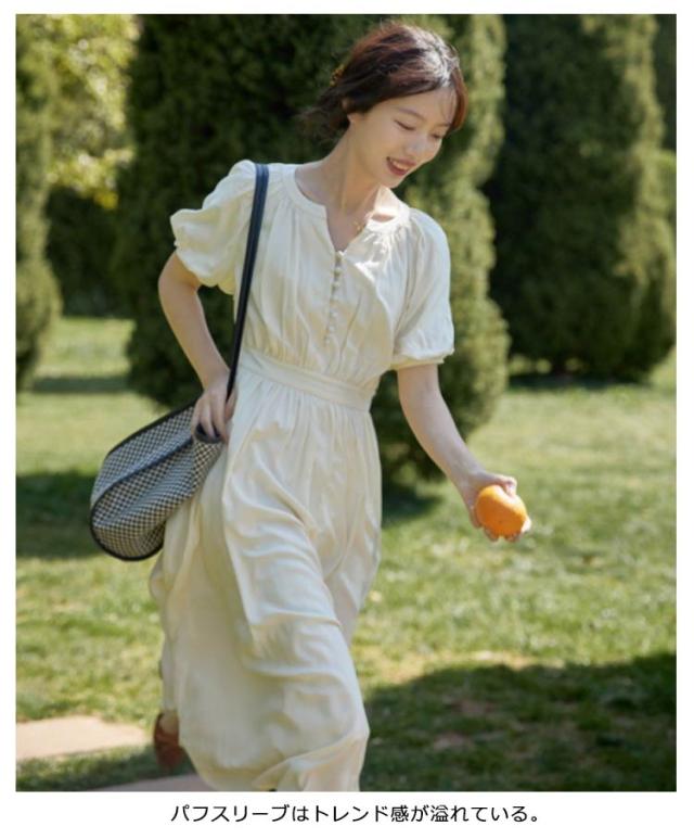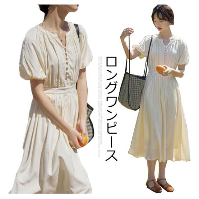 ワンピース ロング マキシ A ライン バルーンスリーブ 半袖 Vネック パフスリーブ 無地 ワンピ レディース フレンチ風 ベージュ 可愛い きれい カジュアル 送料無料