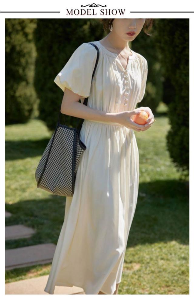 | 大人リラックスムードなロング丈ワンピ。 パフスリーブはトレンド感が溢れている。 ウエストも高く見え、脚長効果も。 広がりすぎない大人シルエットのスカートが下半身もすっきり見えます。 | |