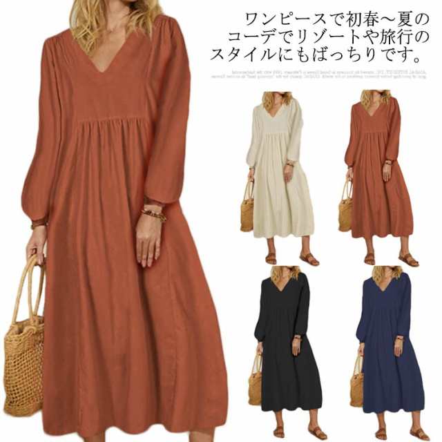 ワンピース ロングワンピ Aライン フレアワンピース ミモレ丈ワンピース 長袖 Vネック パフスリーブ フォーマル 通勤 二次会 入園式 卒業式 無地 優雅 お洒落 20代 30代 40代