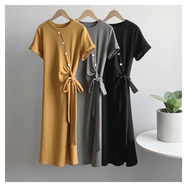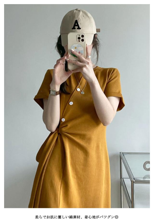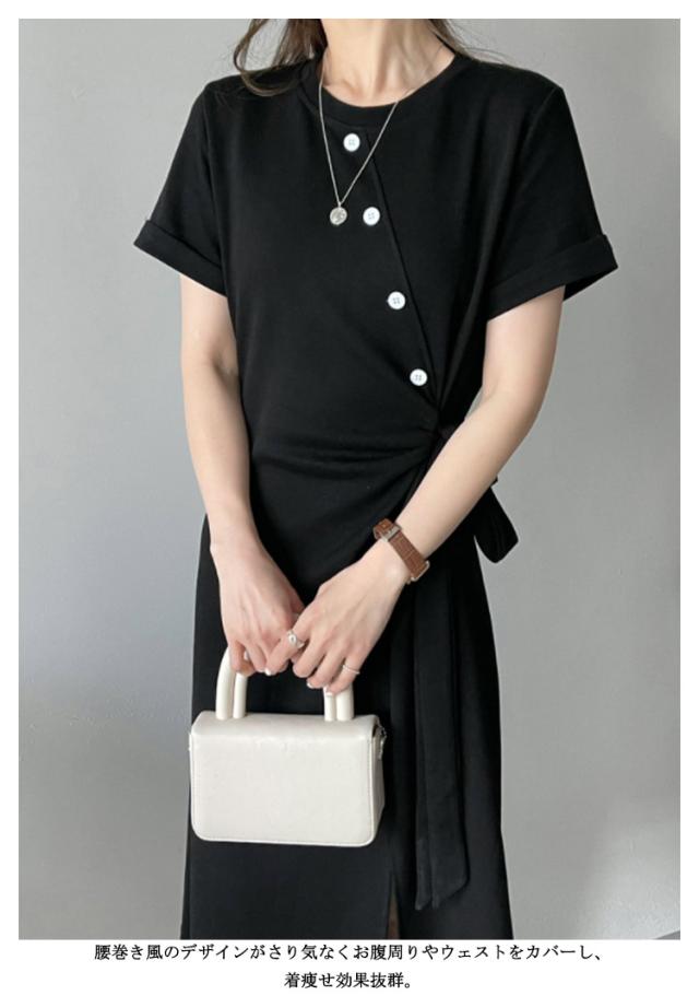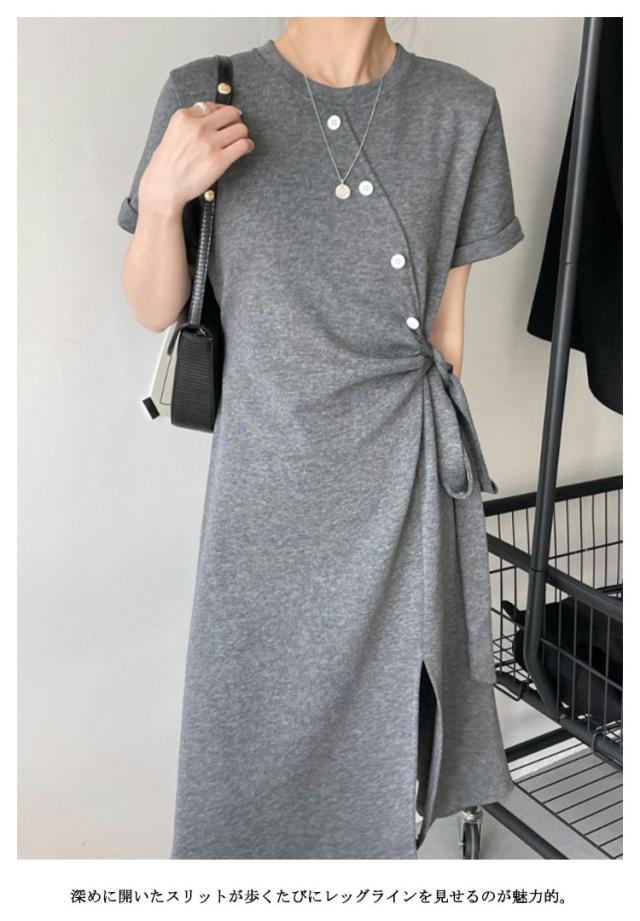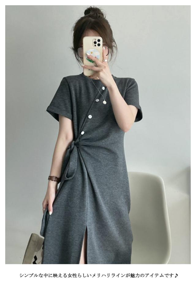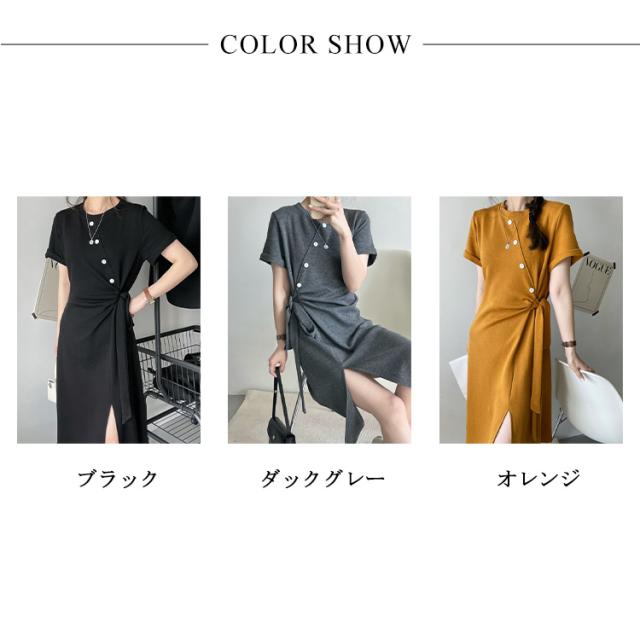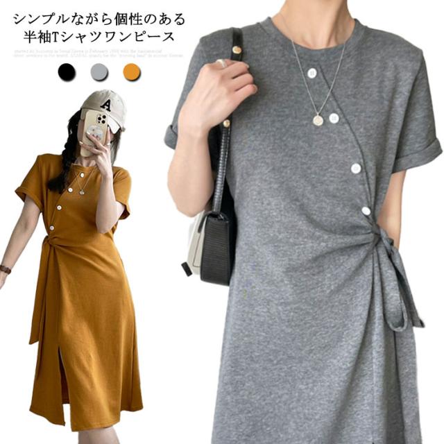 送料無料 ロングワンピース 半袖 ワンピース レディース Tシャツワンピース ミモレワンピース スリット入り ミモレ丈 無地 Aライン 着痩せ ウエストリボン 春夏 ハイウエスト カジュアル 可愛い おしゃれ 通勤 OL お出かけ