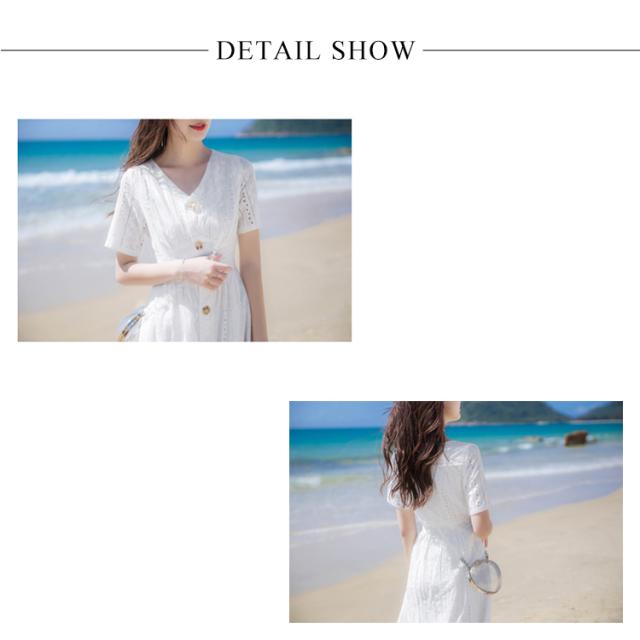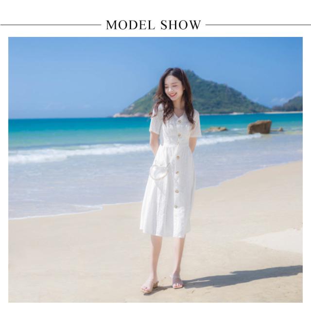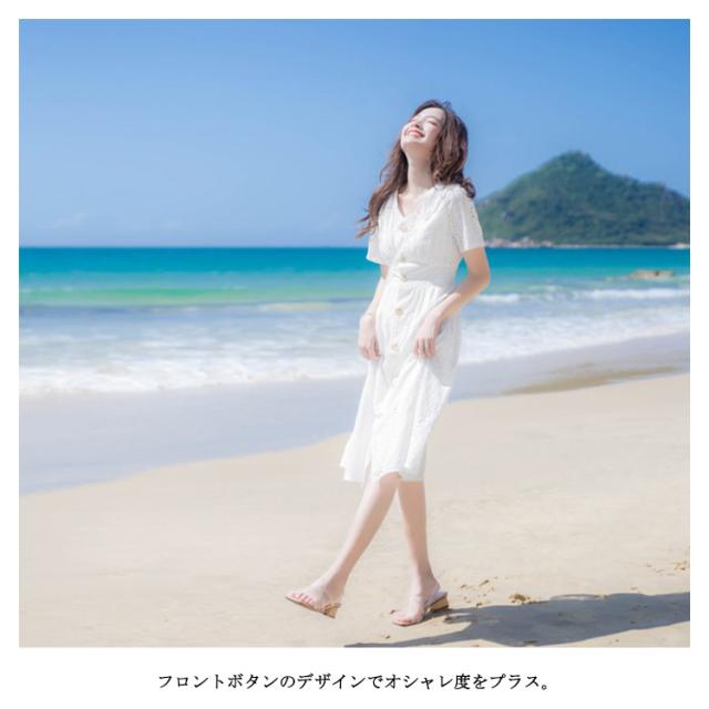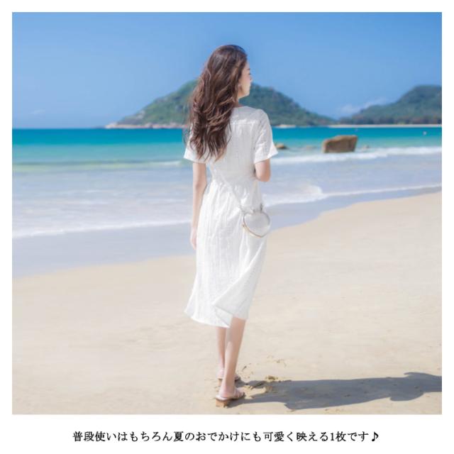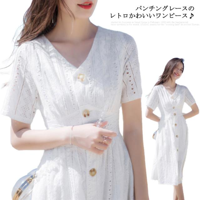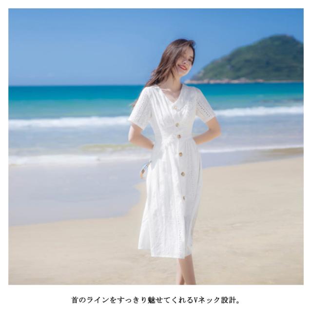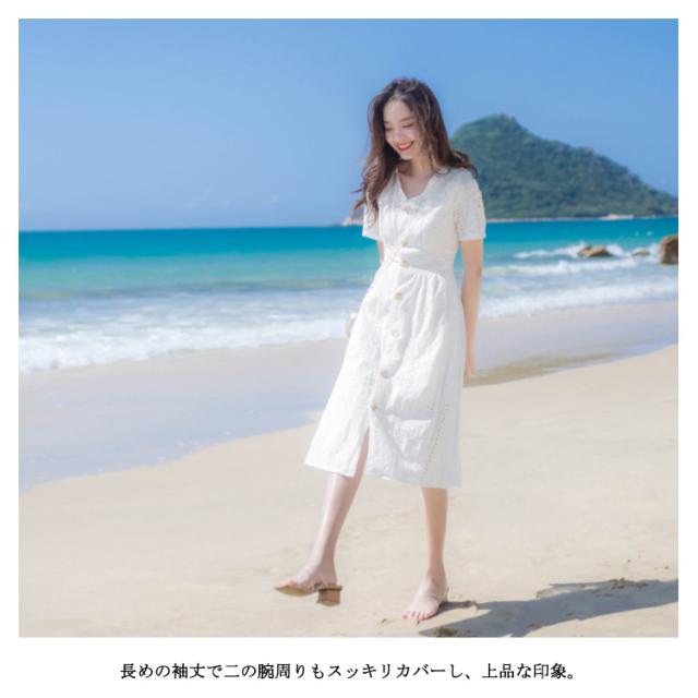送料無料 ワンピース レディース ミモレワンピース ミティアム丈 体型カバー コットンレース 半袖 Vネック パンチング ロングワンピース ミモレ丈 スカラップ フレア ふんわり ゆったり 夏 ドレス お洒落 無地 キレイめ 大人可愛い 春夏