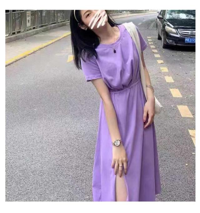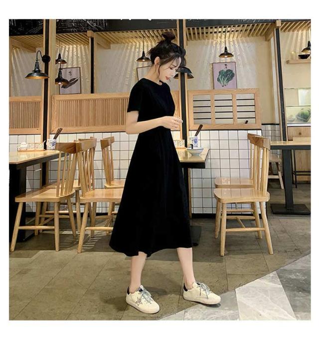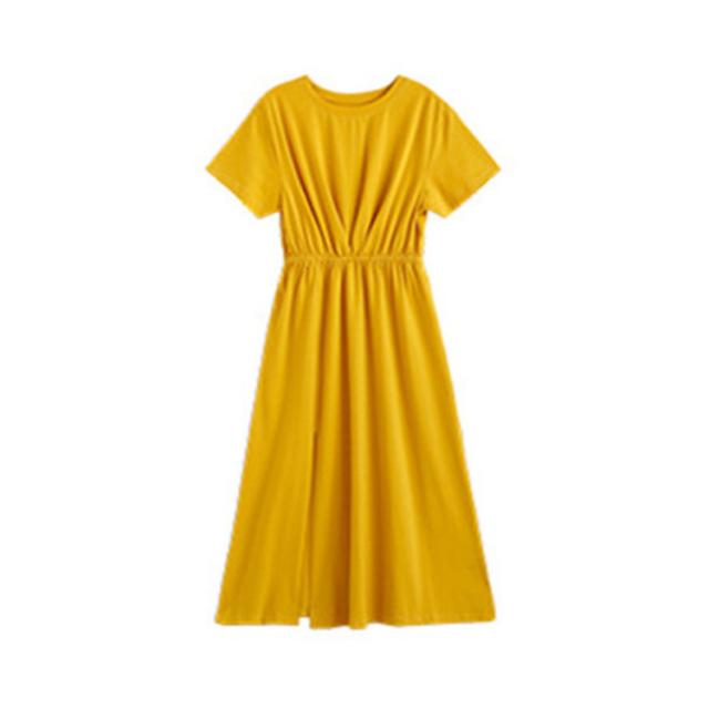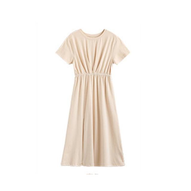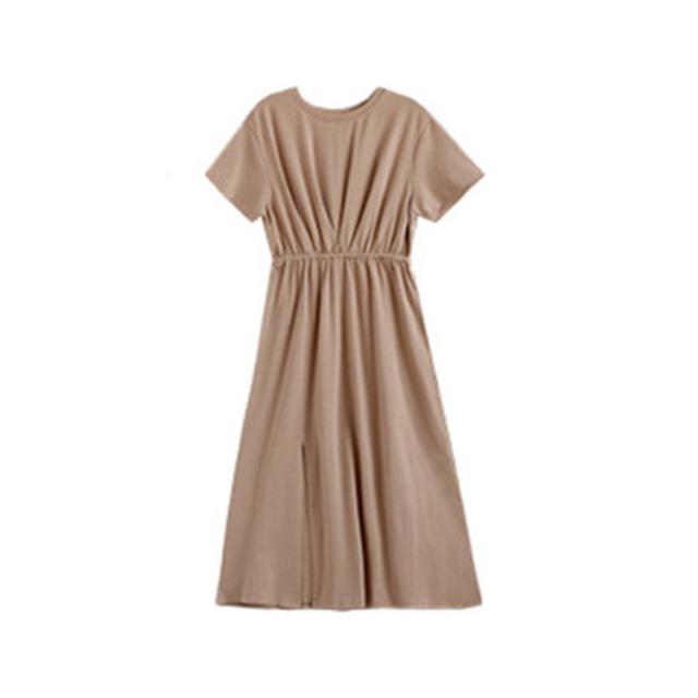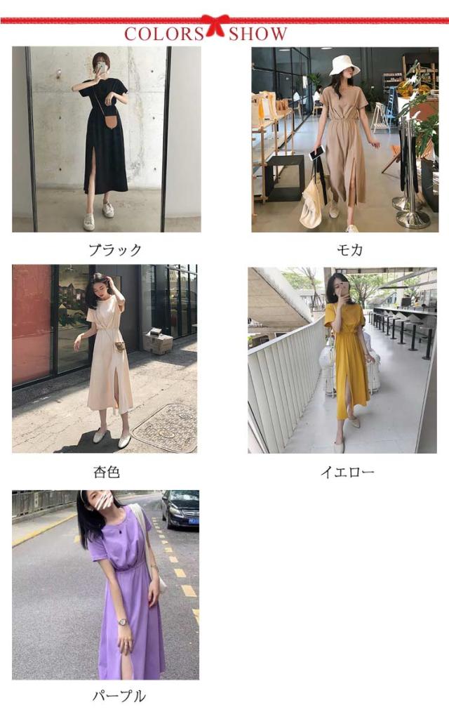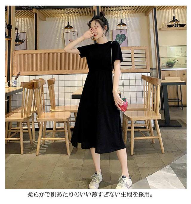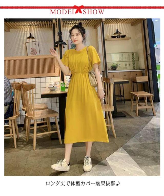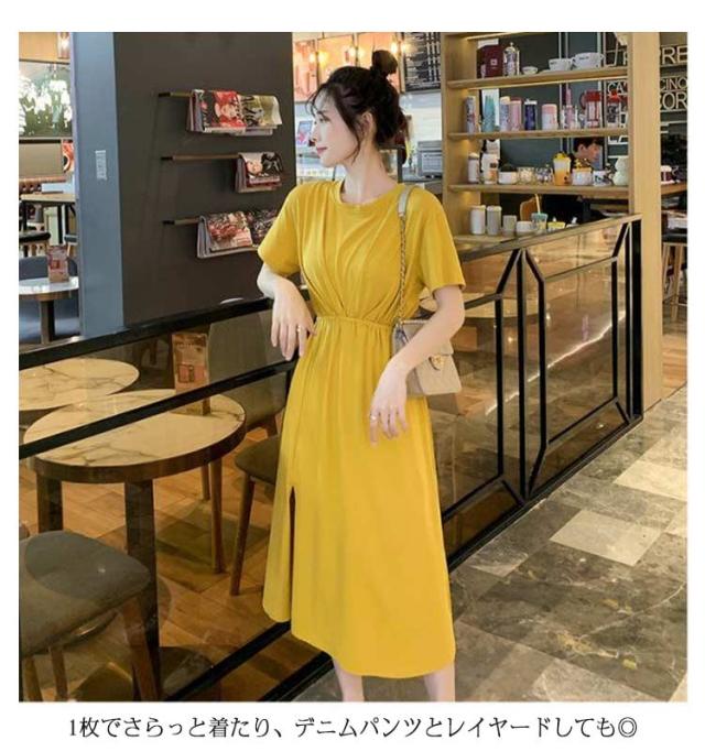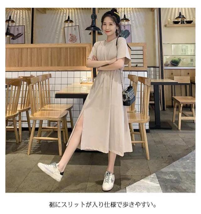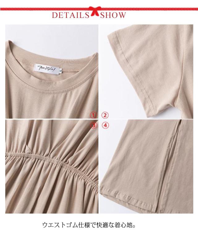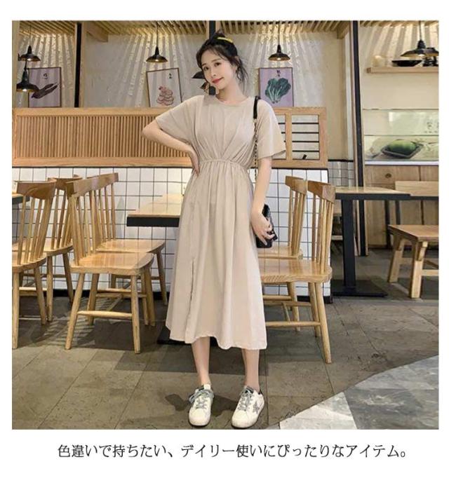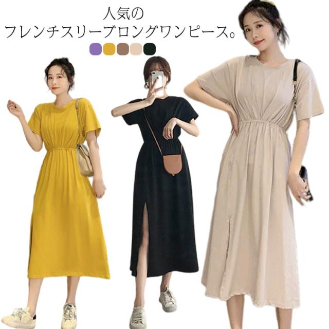 ワンピース ロングワンピース レディース フレンチスリーブ ラウンドネック カットソー Tシャツ ワンピ ロング丈 マキシ丈 半袖 ゆったり ルームウェア 楽ちん 部屋着 体型カバー スリット入り 送料無料 ウエストゴム コットン 着痩せ おしゃれ 旅行 春夏 大きいサイズ