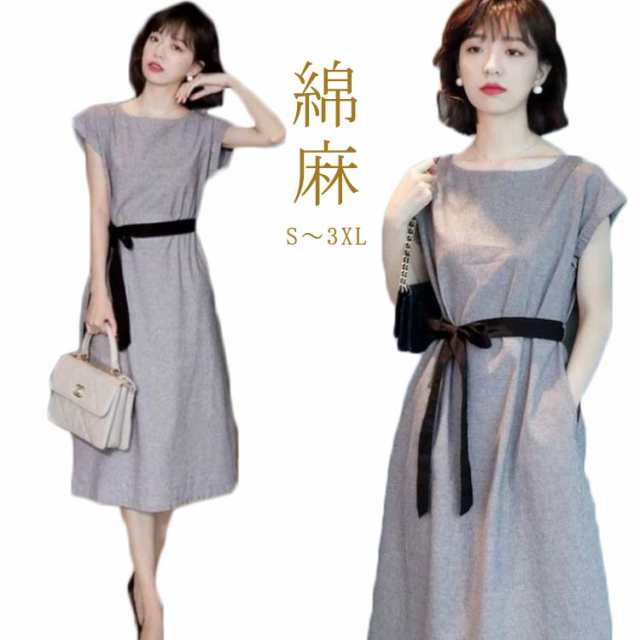 送料無料 ワンピース ロングワンピース リネンワンピース 綿麻 リネン マキシ丈ワンピース 半袖 aライン フレアワンピース 夏 麻 ゆったり 体型カバー ワンピース 通勤 フォーマル 千鳥柄 ウエストリボン ポケット付き