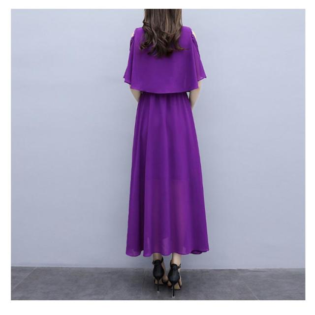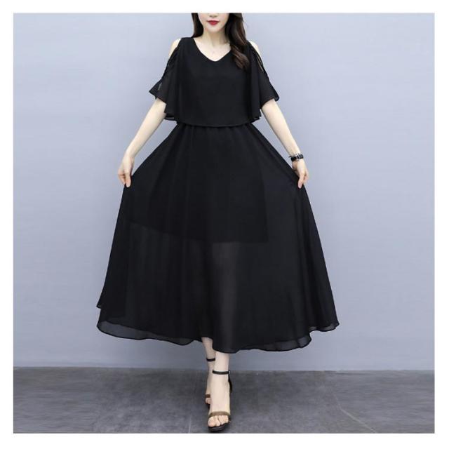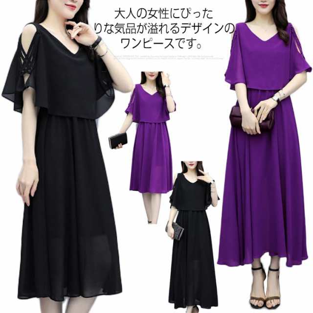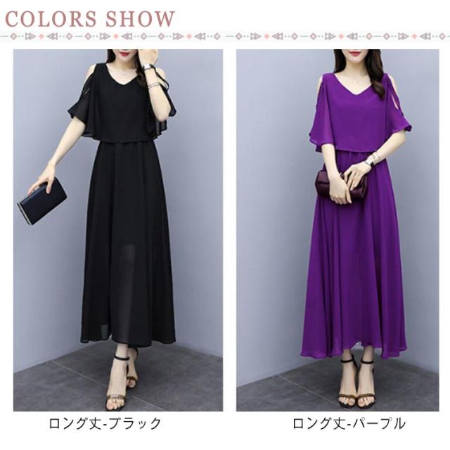 ワンピース 半袖 オープンショルダー 膝丈 ロング丈 シフォンワンピース 女子会 レディース ふんわり お洒落 大きいサイズ 体型カバー キレイめ 夏物 旅行 通勤