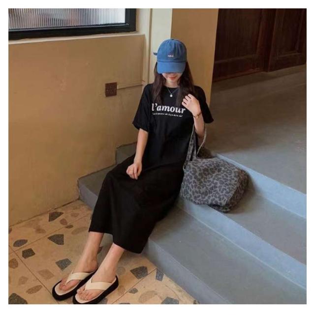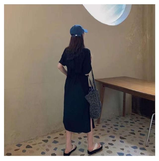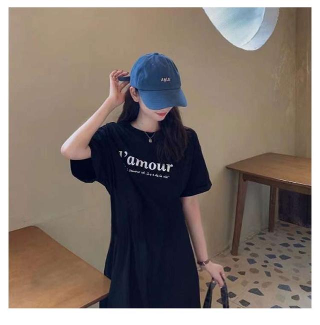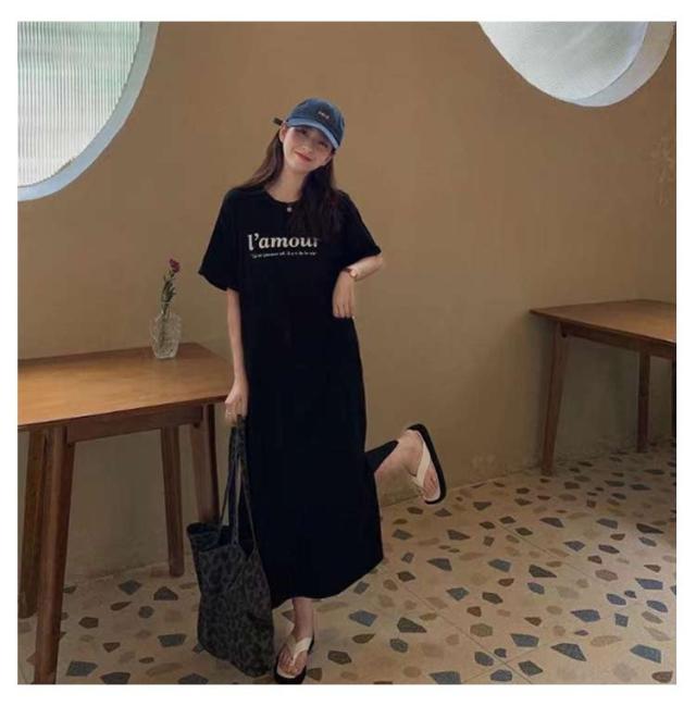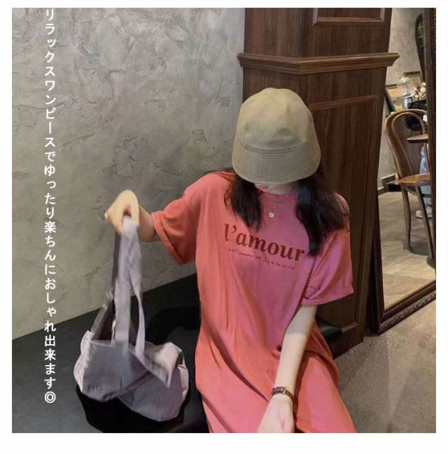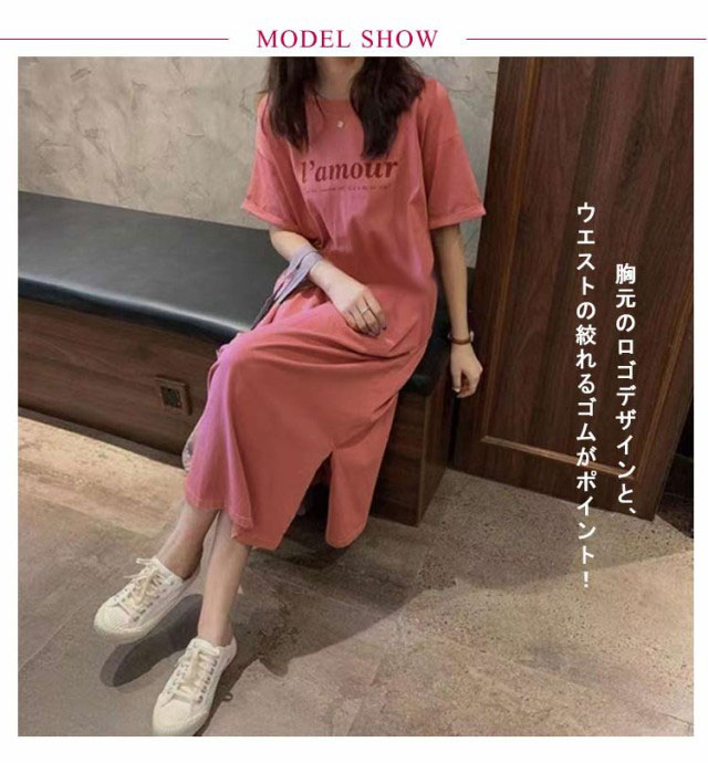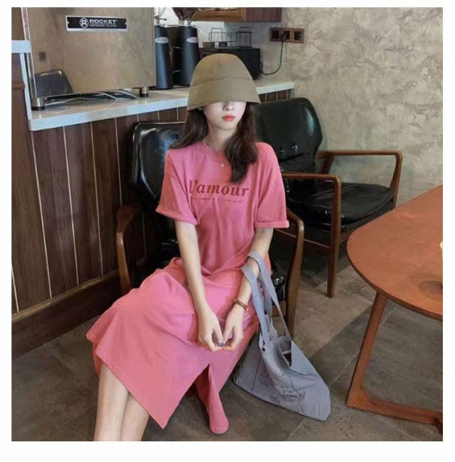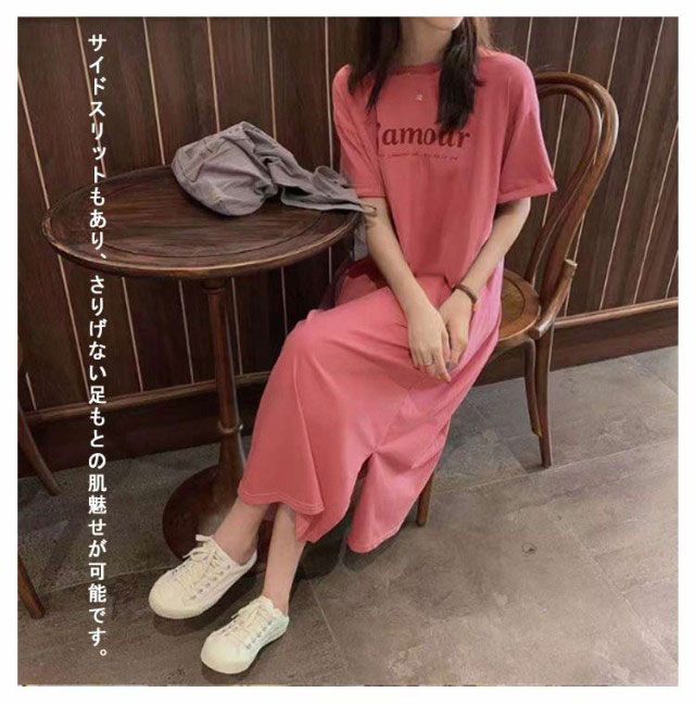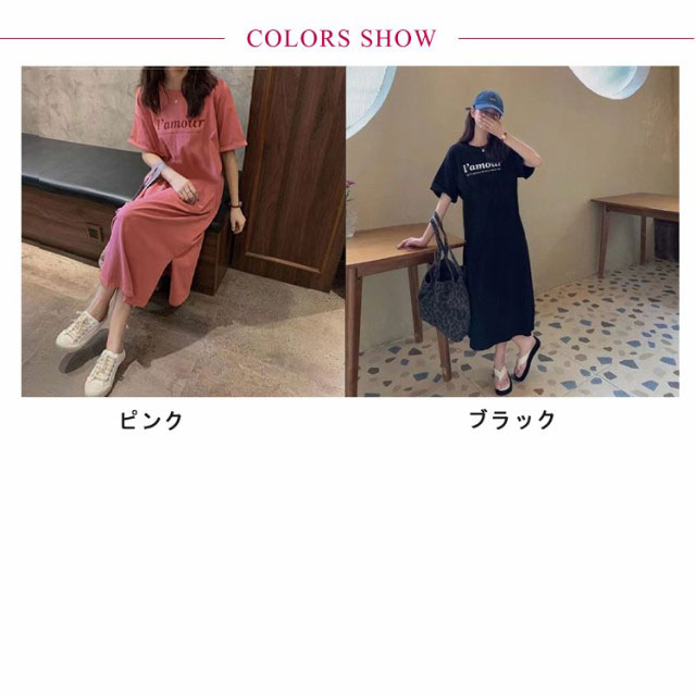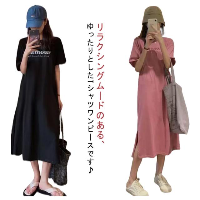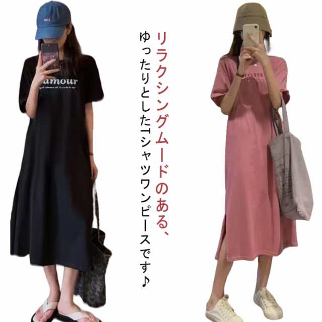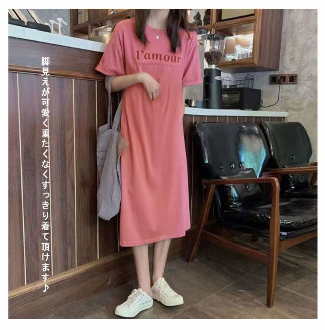 Tシャツ ワンピース レディース 春夏 大人 ロゴ入り クルーネック スリット 春 半袖 ゆったり ルームウェア 大人 カジュアル かわいい 楽ちん 部屋着 マタニティ 韓国ファッション ピンク ブラック 黒