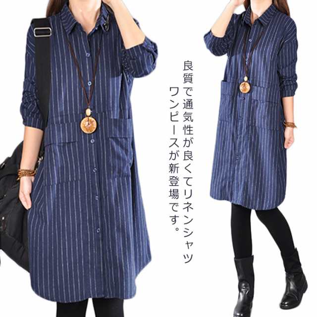 シャツワンピース リネンシャツ ロングシャツ ストライプ柄 レディース 綿麻 体型カバー リネン ボタン付き 森ガール トップス ゆったり カジュアル ブラウス 長め OL 着痩せ 新作