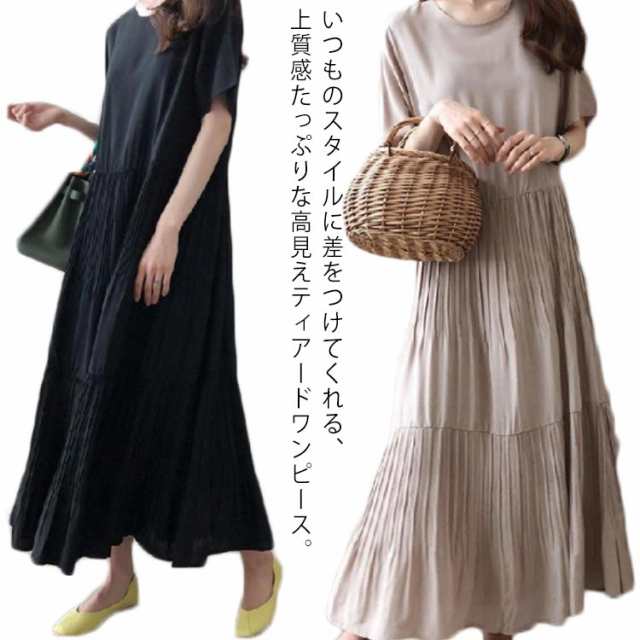 半袖ワンピース レディース ティアードワンピース プリーツ フレア ロングワンピース 半袖 ゆったり Aライン 切り替え マキシワンピース 無地 きれいめ 体型カバー 上品 きれいめ 通勤 ミセス 大人 マタニティ 春 夏 秋 送料無料