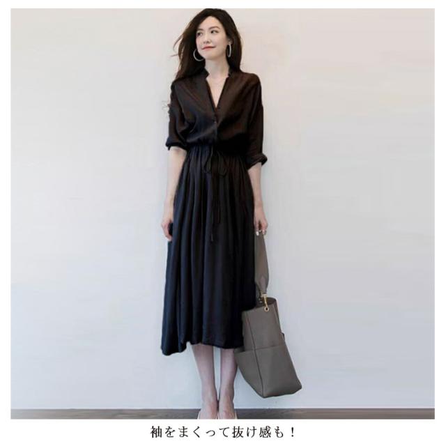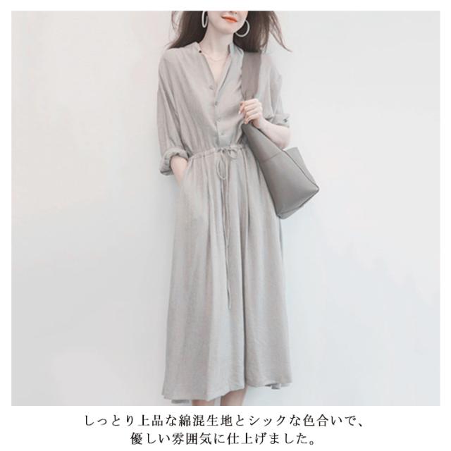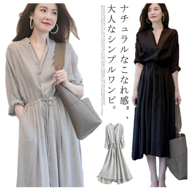 長袖 ロングワンピース シャツワンピース Vネック レディース 春 夏 秋 ミモレ丈 ロング丈 ワンピース 無地 リボン付き Aライン ゆったり 大きいサイズ 体型カバー きれいめ おしゃれ 通勤 入園式卒業式 送料無料