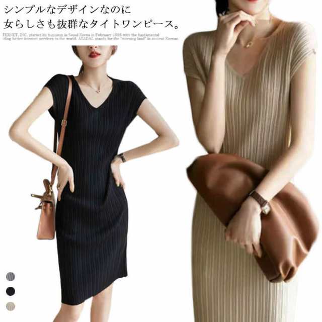 着やせ フレンチスリーブ 膝丈 オフィス 半袖ワンピース 春夏 スリム タイトワンピース タイト サマーニット プリーツ リブ セクシー タイトワンピース エレガント きれいめ ニットワンピース 大人かわいい グレー ベージュ vネック
