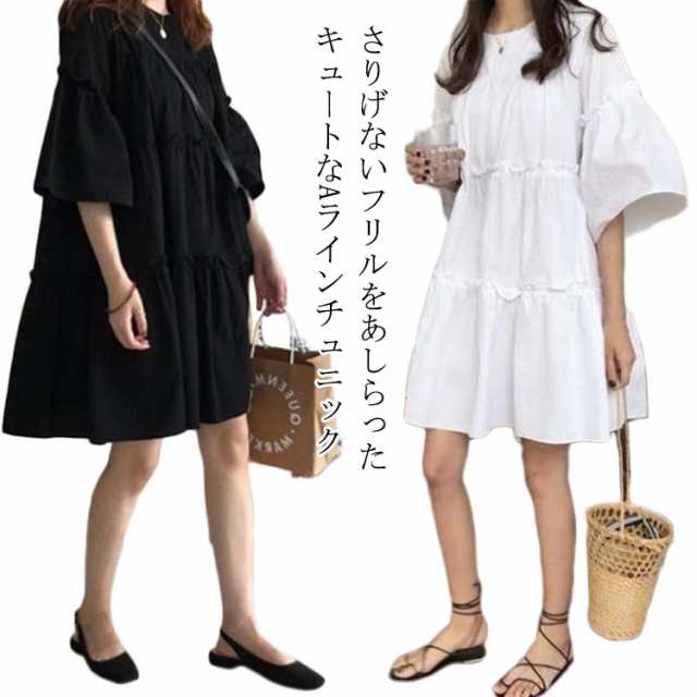 Aライン チュニック ワンピース チュニックワンピース トップス カットソー 半袖 レディース 着?せ 大きいサイズ ティアード 無地 シンプル 可愛い フレア フリル ミニワンピース ゆったり 体型カバー 送料無料 ブラック ホワイト