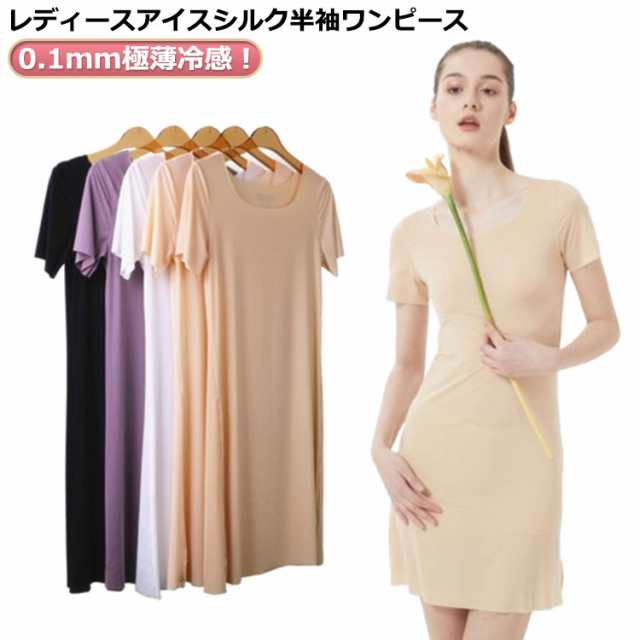 アイスシルク スリップ ロング ワンピース スリップ 半袖 無地 部屋着 透け防止 キャミワンピース インナー ペチコート インナーワンピース 汗取り 吸汗速乾 防臭 通気 快適 ブラック ホワイト ダークベージュ パープル ピンク ライトベージュ