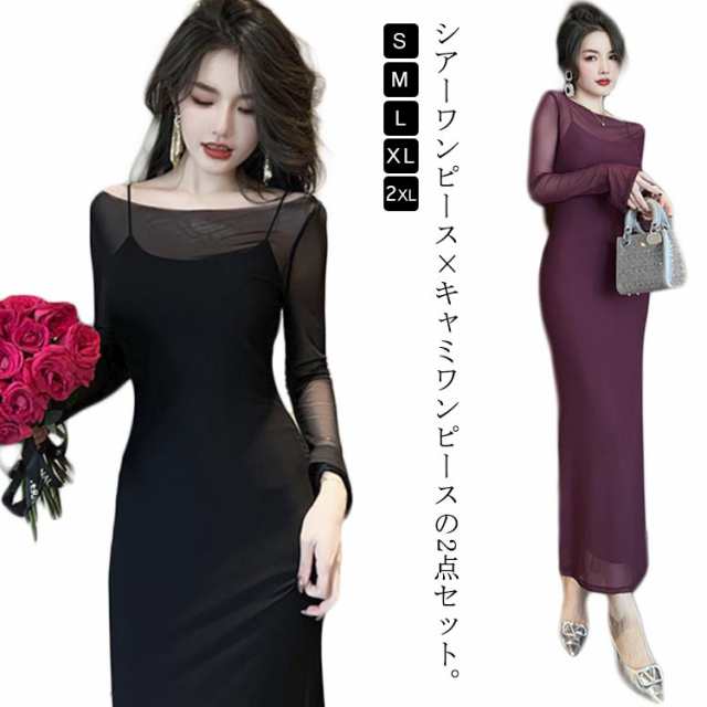 タイトワンピース ロング丈 2点セット キャミワンピース シアートップス シアーワンピース ドレス シースルーワンピース シースルー ワンピース ロング キャミ フェミニン セクシー きれいめ パーティー 韓国ファッション S M L XL