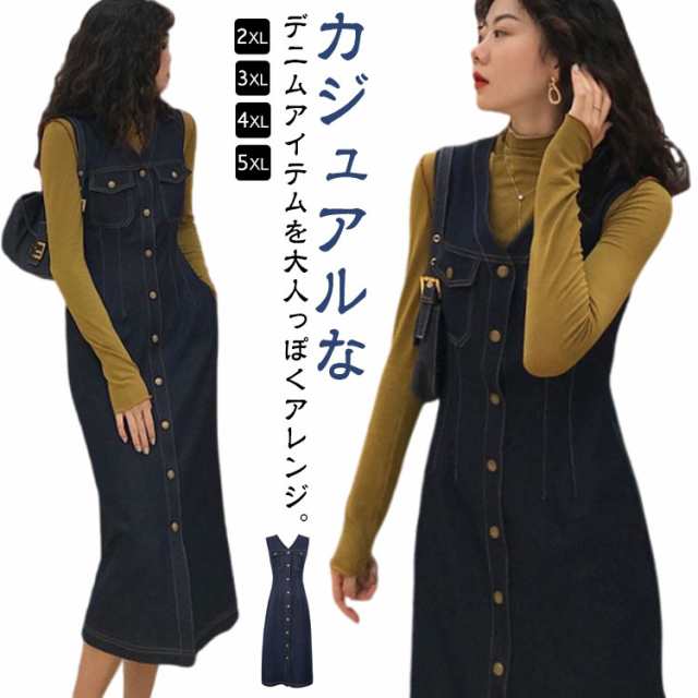 デニム ジャンパースカート ロング レディース 春 秋 冬 デニムワンピース ノースリーブ ジャンスカ Vネック スリム タイト フロントボタン レトロ ヴィンテージ 厚手 大人 カジュアル 通勤 オフィス レイヤード 重ね着 コーデ オールインワン おしゃれ 【送無】