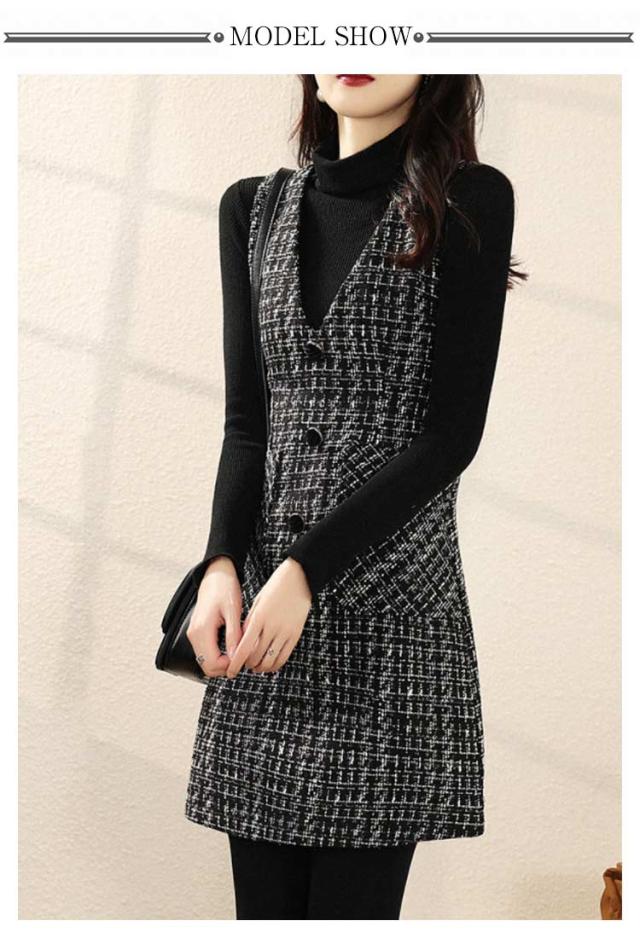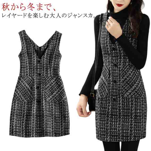 ジャンパースカート ツイード レディース 50代 大人 ジャンスカ ワンピース 深Vネック ノースリーブ ショート丈 膝上丈 きれいめ 厚手 秋 冬 重ね着 レイヤード コーデ スリムフィット 細身 通勤 オフィス チェック柄 おしゃれ 大きいサイズ