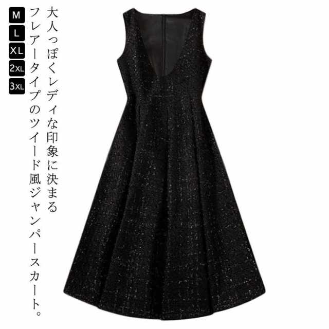 ジャンパースカート ツイード風 レディース ノースリーブ ワンピース 深Vネック aライン ロング ジャンスカ 50代 大人 きれいめ フレアワンピース 秋 冬 厚手 ツイードワンピース 袖なし 重ね着 レイヤード コーデ キラキラ チェック柄 おしゃれ 大きいサイズ 【送料無料】