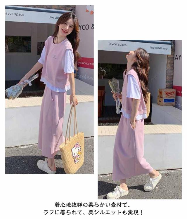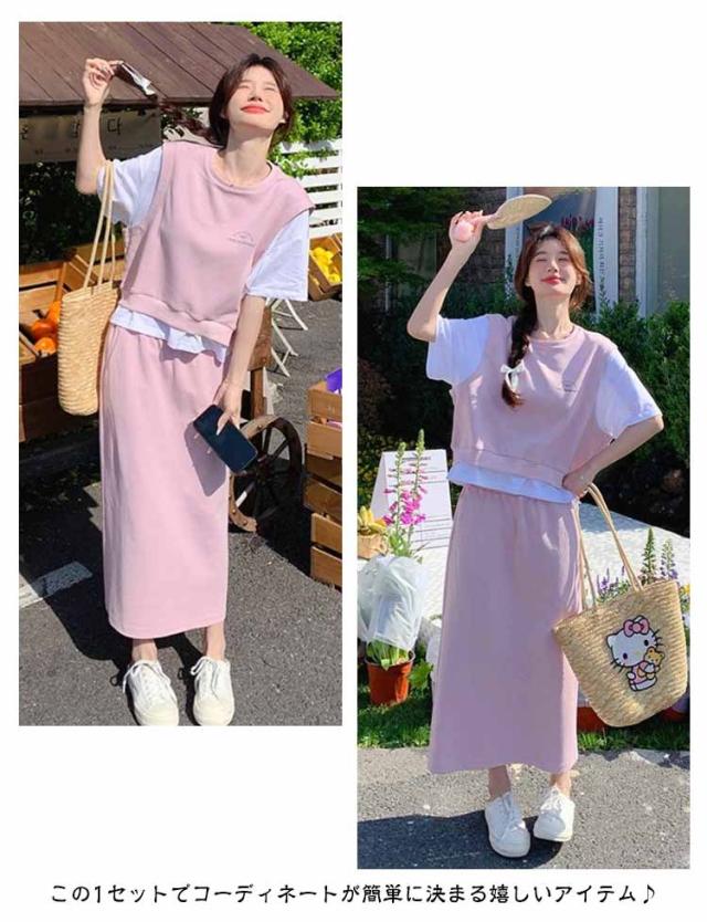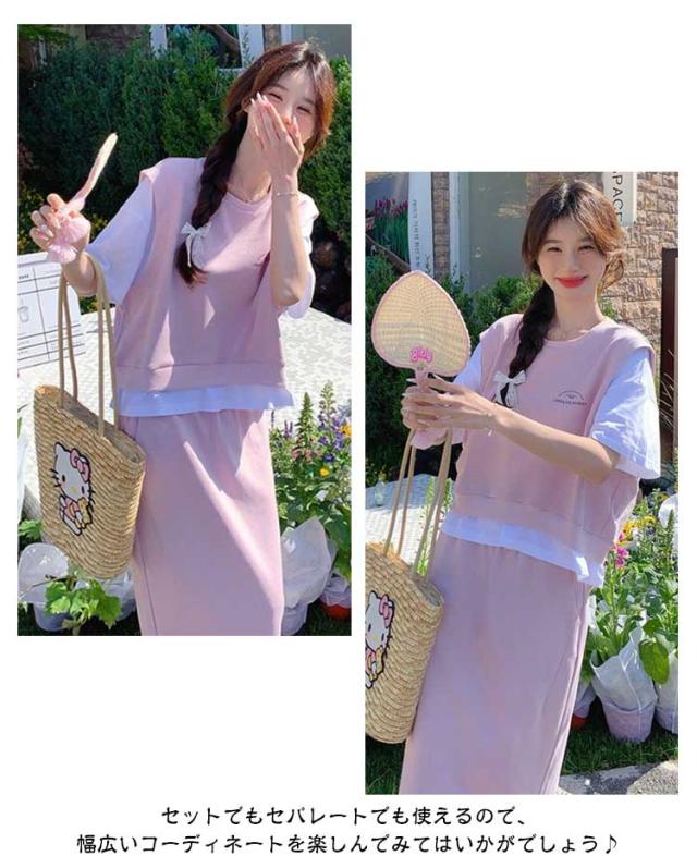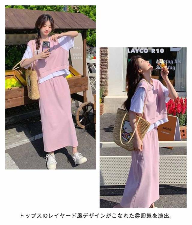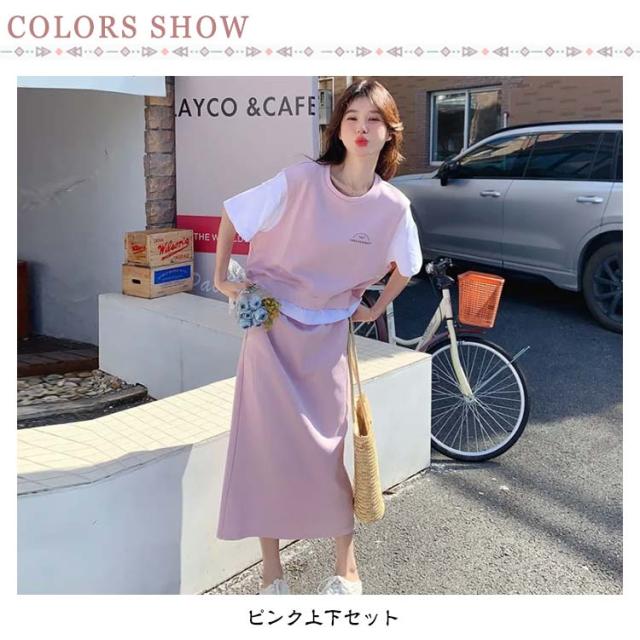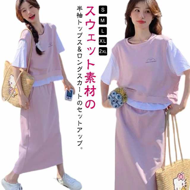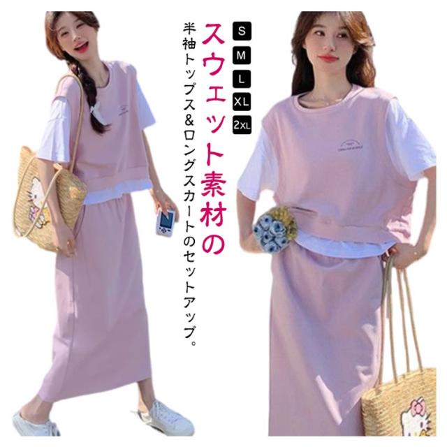 送料無料 セットアップ スウェット スカート 2点セットアップ レイヤード風 半袖 Tシャツ スウェットトップス カット ロングスカート スウェットスカート 体型カバー パーカー 上下セット 春夏 20代 30代 40代 50代