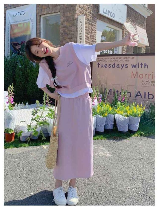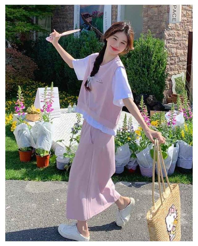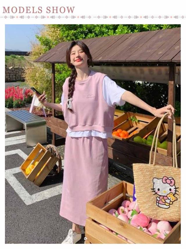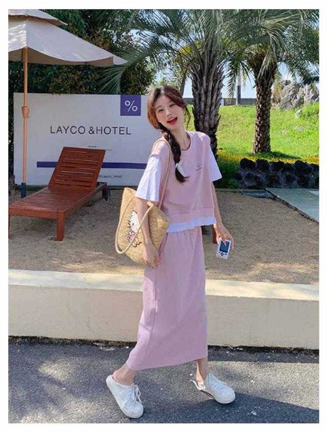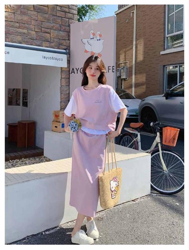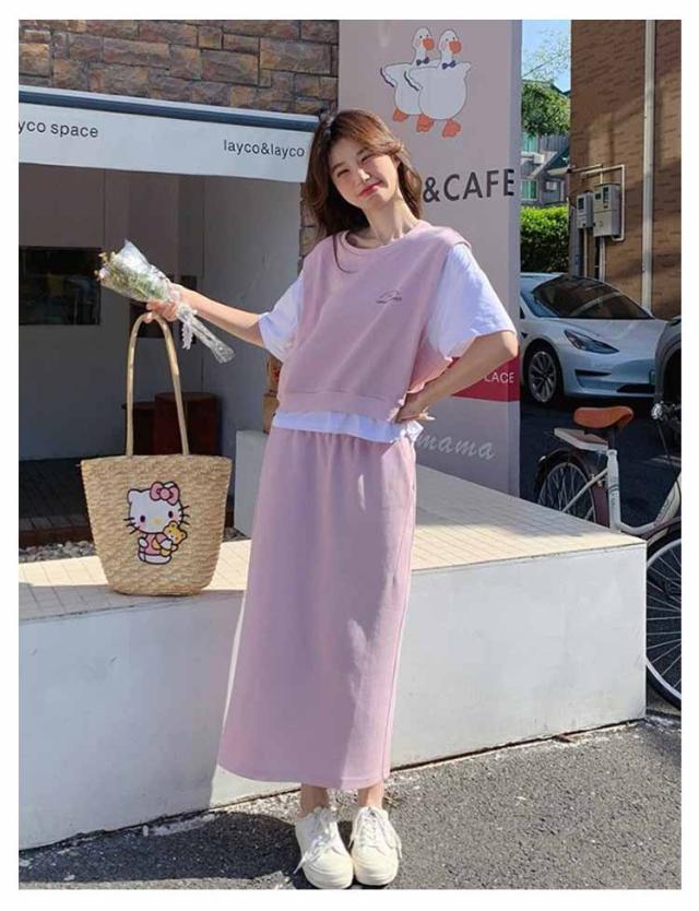 送料無料 セットアップ スウェット スカート 2点セットアップ レイヤード風 半袖 Tシャツ スウェットトップス カット ロングスカート スウェットスカート 体型カバー パーカー 上下セット 春夏 20代 30代 40代 50代
