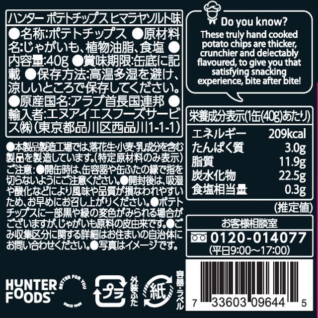 商品名 ハンター ポテトチップス ヒマラヤソルト味 40g×3個 容量 40g×3個 原材料名 じゃがいも、植物油脂、食塩 アレルギー特定原材料 − 賞味期限 商品の発送時点で、30日以上あるものをお届けいたします 保存方法 高温多湿を避け、涼しいところで保管してください