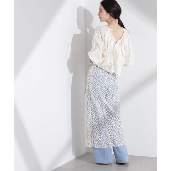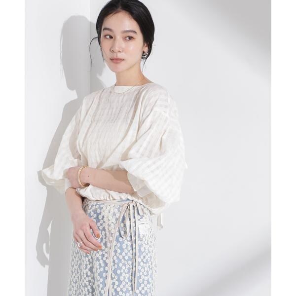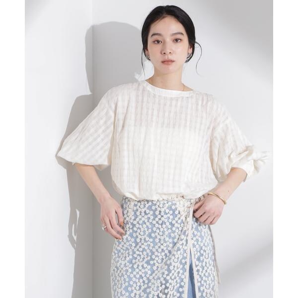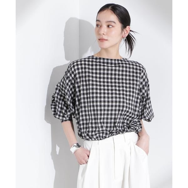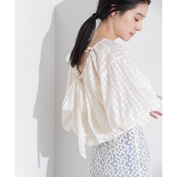 透け感のあるギンガムチェックのバルーンブラウス。後ろが大きく開いたデザインで、リボンの絞りでギャザーと開き具合を調整できるバックコンシャスなデザインがポイント。フェミニンな要素もありながら、合わせるボトムス次第で大人っぽくお洒落なスタイルに決まる一着です。