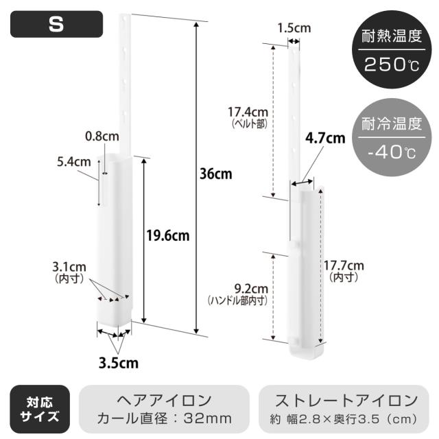 | 対応サイズ | カール部径3.2cm以下のヘアーアイロン 約 幅2.8×奥行3.5cm以下のストレートアイロン ※ヘアーアイロンのサイズや形状によっては収納できない場合があります。 |