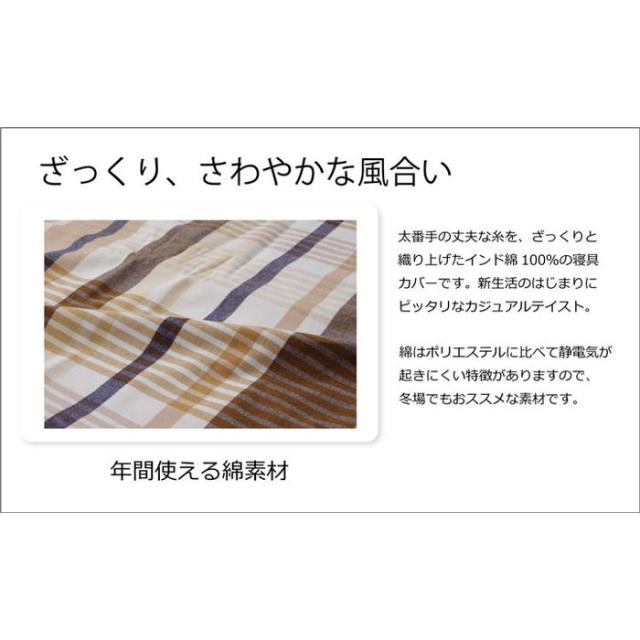 綿の産地、インドの綿を使用しています。太番手の糸を使い、ざっくりとした風合いです。綿はポリエステルに比べ静電気がおきにくく、繊維の中でも特に肌触りが良いのが特徴です。季節を選ばずオールシーズンご使用頂けます。ご家庭の洗濯機で洗える)ので、清潔にご使用頂けます。