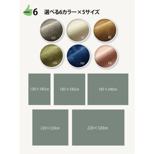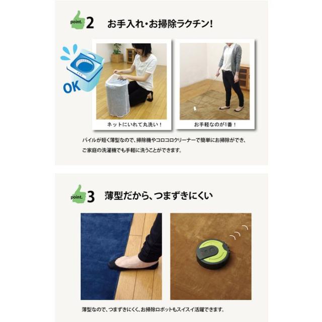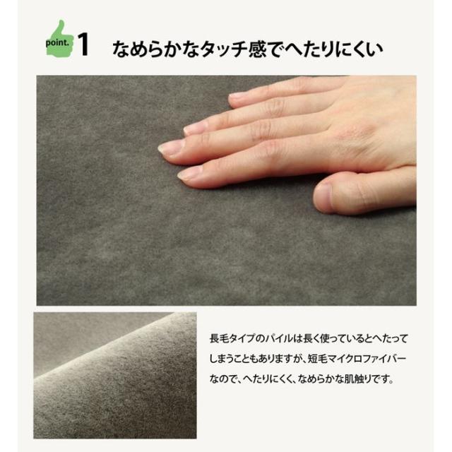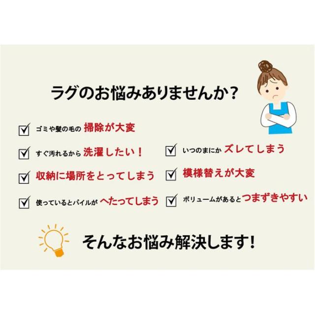 いままでのラグのご不満を解消すべくつくった、使いやすさにこだわったラグです。多色展開ですのでお部屋に合わせてお好きな色をお選び下さい。ラグの不満を解消できる10個のポイント(1)ソフトな肌触り。表地には短毛のマイクロファイバー(超極細繊維)を使用していますので、ソフトな肌触りです。(2)ヘタリにくい。目付は1平方メートルあたり240gで、密度が高くヘタリにくい仕様です。(3)オールシーズン使える。ホットカーペット、床暖房対応です。サラリとしていますので、べとつかず暑い時期にもご使用頂けます。(4)ホコリが取れやすい。毛足が短いので掃除機もかけやすく、毛足にゴミが絡みにくい。マクロファーバーは遊び毛がでにくいという特長も持っています。(5)つまづきにくい。厚み約4〜5mmで段差が少ないのでお子様やお年寄りにも安心です。(6)すべりにくい。普段見えない裏部分にもこだわりました。フローリングを傷つけにくいよう裏には不織布を貼っています。また、すべりにくい加工を施していますので、部屋を走り回るのが大好きなお子様やペットがいるご家庭にも安心てご使用頂けます。(7)軽量で持ち運び楽々。(8)洗濯機で洗える(洗濯ネット使用)。ご家庭の洗濯機で洗えるウォッシャブル仕様です。軽量なので干しやすいです。(9)インテリア性へのこだわり。ヘリ部分はヘムをまかずにオーバーロック加工で仕上げました。お部屋に敷いて頂いた際の見た目にもこだわりました。(10)コンパクト収納。薄手なので小さく折りたたむことができます。収納時にも場所をとりません。