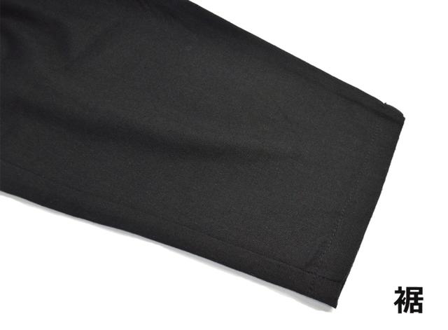 ■特徴としてウエストゴムでずり落ちず動きやすく、ノーストレスなゆったりめのサイズ感と衛生的に裾を擦らないようにテーパードシルエットになっている。