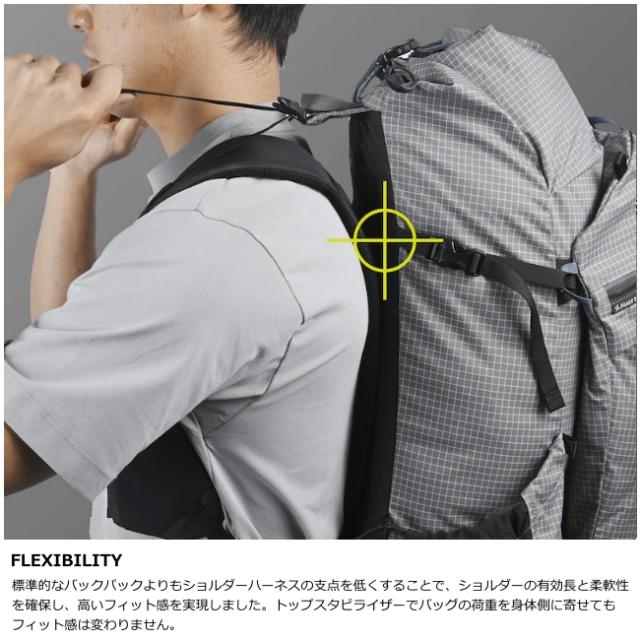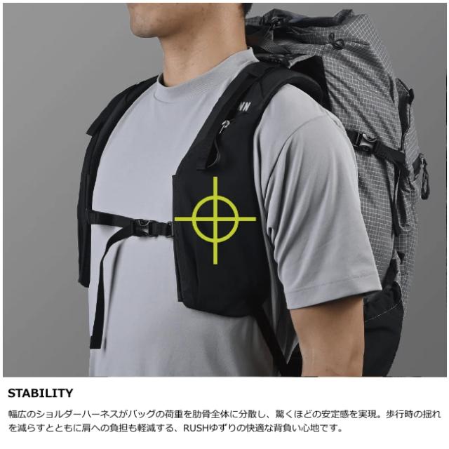 アルパインザックのような細身のシルエットを基本にしながら、肩甲骨の周辺にボリュームを持たせることで荷重バランスを最適化しています。