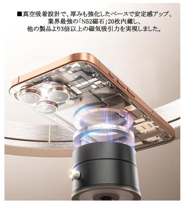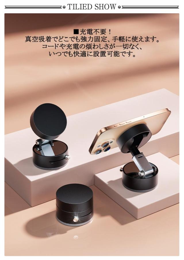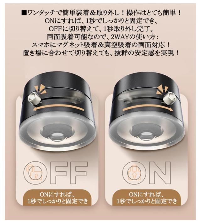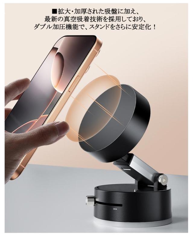 | 【2個セット】【充電不要、両面吸着】【SNSで話題のスマホホルダー】 ■充電不要、両面吸着:真空吸着式&マグネット式で、どこでも安定使用可能! ■充電不要!真空吸着でどこでも強力固定、手軽に使えます。コードや充電の煩わしさが一切なく、いつでも快適に設置可能です。 ■真空吸着設計で、厚みも強化したベースで安定感アップ、業界最強の「N52磁石」20枚内蔵し、他の製品より3倍以上の磁気吸引力を実現しました。 ■拡大・加厚された吸盤に加え、最新の真空吸着技術を採用しており、ダブル加圧機能で、スタンドをさらに安定化! ■車載ホルダーとしても完璧!吸着力が強いため、運転中の振動や急カーブでも安定性が保たれ、スマホやナビの使用が快適になります。 ■ワンタッチで簡単装着&取り外し!操作はとても簡単!ONにすれば、1秒でしっかりと固定でき、OFFに切り替えて、1秒取り外し完了。 両面吸着可能なので、2WAYの使い方:スマホにマグネット吸着&真空吸着の両面対応!置き場に合わせて切り替えても、抜群の安定感を実現! | |