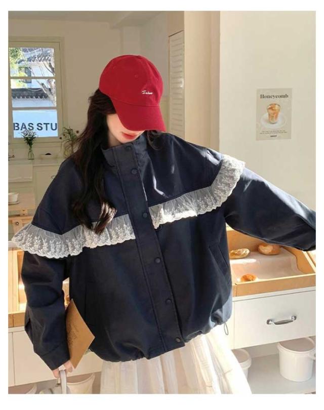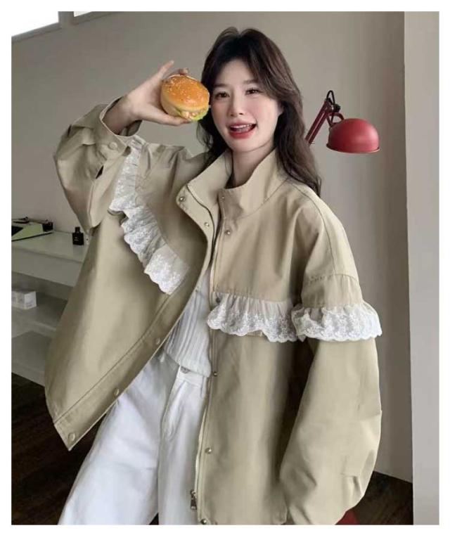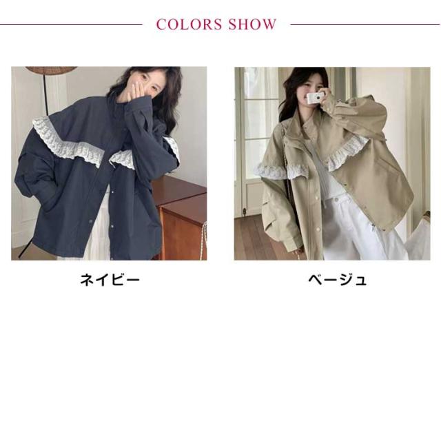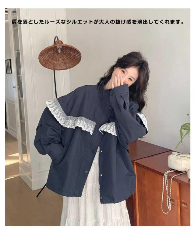 スプリングコート レディース ジャケット ショート丈 レース フリル シャツ スタンド カラー 軽量 薄手 防風 大人 カジュアル ライトアウター ブルゾン 羽織り おしゃれ きれいめ 可愛い ファション 10代 20代 30代 40代