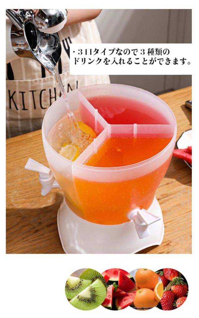 | ・冷蔵庫にいれたままドリンクサーバー ・3口タイプなので3種類のドリンクを入れることができます。 ・数種類のドリンクを揃えておけば、おうちカフェ気分を味わえちゃう ・レジャーやスポーツシーン、防災用としても活躍。 | |