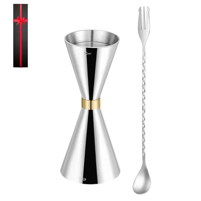 ジガーカップステンレス鋼計量カップ オンスカップ 目盛り付きカップ カクテル計量カップ ステンレス鋼の双頭バースプーン カクテルスプーン(2点セット)