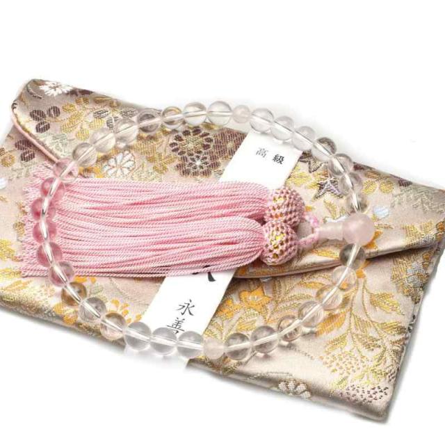 【数珠の特徴】:天然水晶を使用した 紅水晶(ローズクォーツ)の女性用お数珠です。本真珠の様な落ち着いた色合いで、持つ人をより上品な雰囲気に演出してくれます。 また葬式や法事などフォーマルの場で違和感なくお持ち頂けるお数珠です。