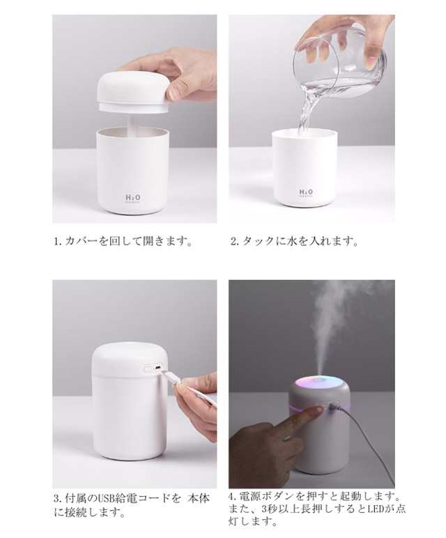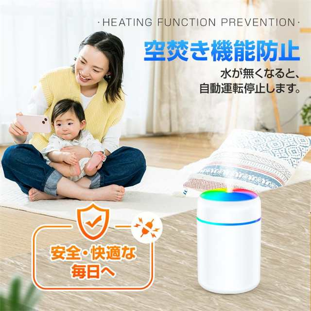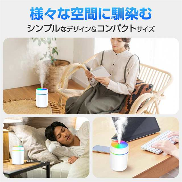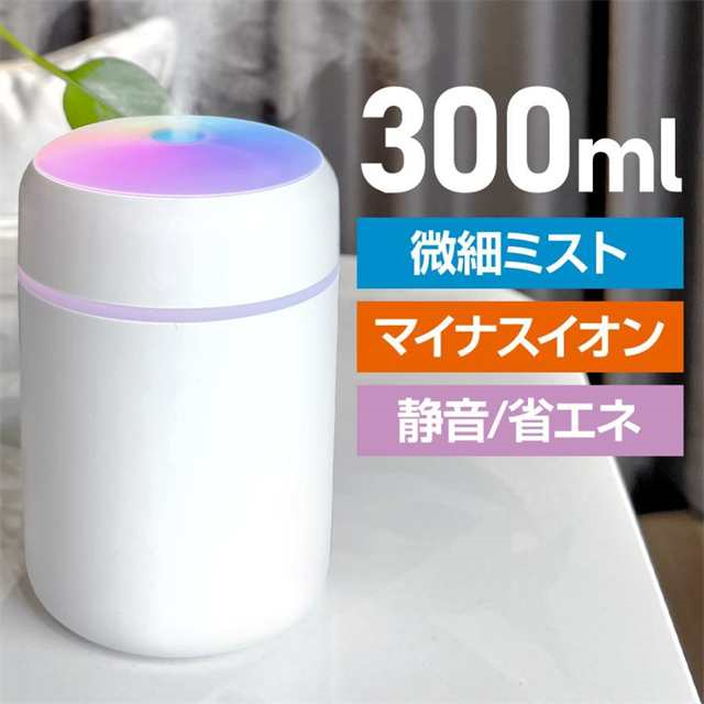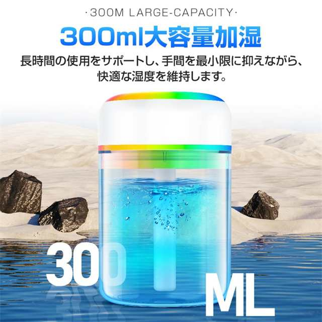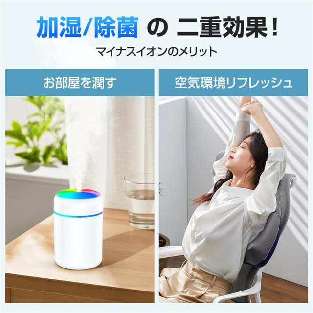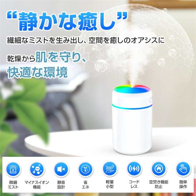 | 【商品特徴】 | 【USB充電式・300ml大容量の 超音波式加湿】 【マイナスイオン除菌】 【超静音設計・12時間連続加湿】 【アロマ対応・空焚き防止】 【オフィス・寝室・車載に最適】 |