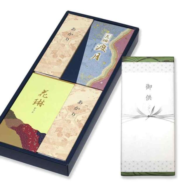 初盆 お供え 線香 ギフト 贈答用 【 花琳・渡月2種 白檀 御供 外のし 内熨斗 ロウソク・お悔やみ弔文 手提げ袋】お悔やみ 四十九日 一周忌 日本製 煙少なめ (オプション無し)