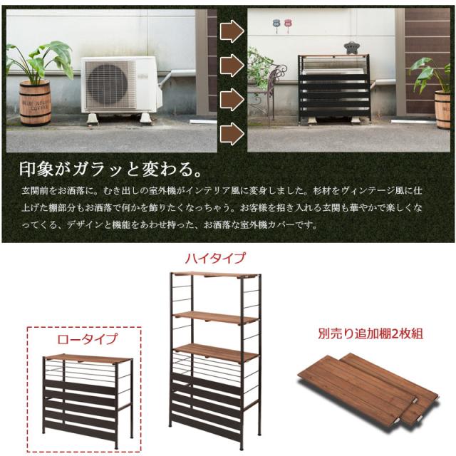 ■商品について/『Seek』シークシリーズは住宅デザインを損なわない外壁になじむスタイリッシュなデザイン性を追求した室外機カバーです。天板や棚板にはヴィンテージな雰囲気の天然木を使用し、フレームをスチールで仕上げた異素材の組み合わせがGood。棚部は取り外し可能式で、天然木ゆえの自然環境による劣化でも別売りの棚に買い替えすることで長く使えます。ガーデニング用品の収納やグリーンを飾るなど便利な上棚付きタイプとシンプルロータイプの展開。是非、野暮ったい室外機をすっきりお洒落に目隠ししましょう。