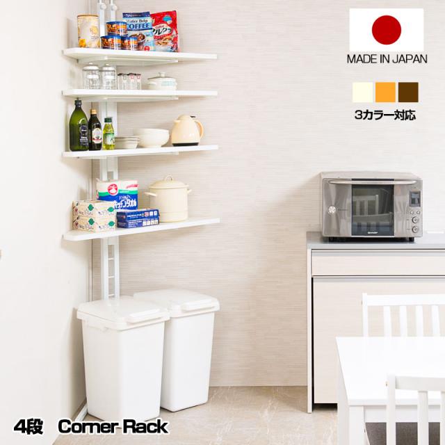 コーナーを有効活用 突っ張り コーナーラック 4段 【送料無料】 おしゃれ インテリア 穴開けない 突っ張り式 リビング キッチン 洗面所 三角 コーナー棚 高さ調節 木製 ウッド ウォールシェルフ 飾り棚