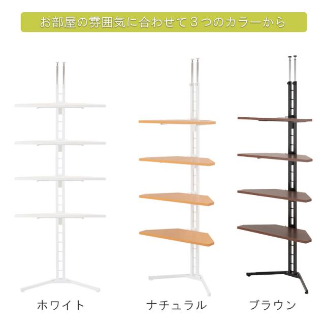 ■商品について/20段階に棚板の位置を調節できる突っ張り式のコーナーラックが登場!高さ調節できるので、デスク上やディスプレイする高さに合わせて設置可能。お部屋の隅のデッドスペースを有効活用できる、コーナーラックならではの使い方で空間を広く使いましょう♪リビングではフィギュアや雑貨等お気に入りをディスプレイしたり、コーナーに設置することでお部屋をすっきり、且つ有効的に使えます。人気のGスポーツなどゲーミング部屋のコーナーに置いてモニター上をフィギュアやゲーミングアイテムでカッコよくディスプレイ。カラーはホワイト・ナチュラル・ブラウンの3色から。ブラウンはフレームがシックなブラックでモダンな印象。
