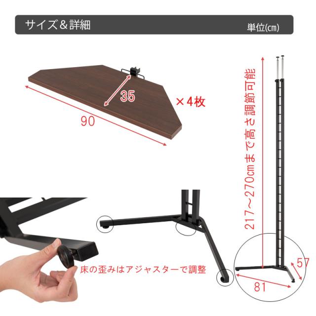 ■商品サイズ/フレーム:(約)幅81×奥行57×高さ217〜270cm、棚板:(約)幅90(奥側40)×奥行35cm、脚部:(約)幅2×高さ4(アジャスター1含む)